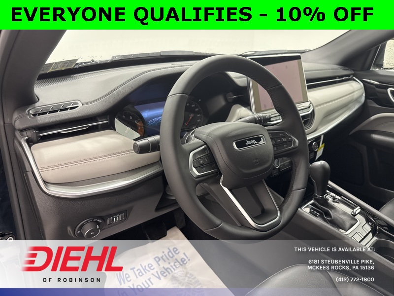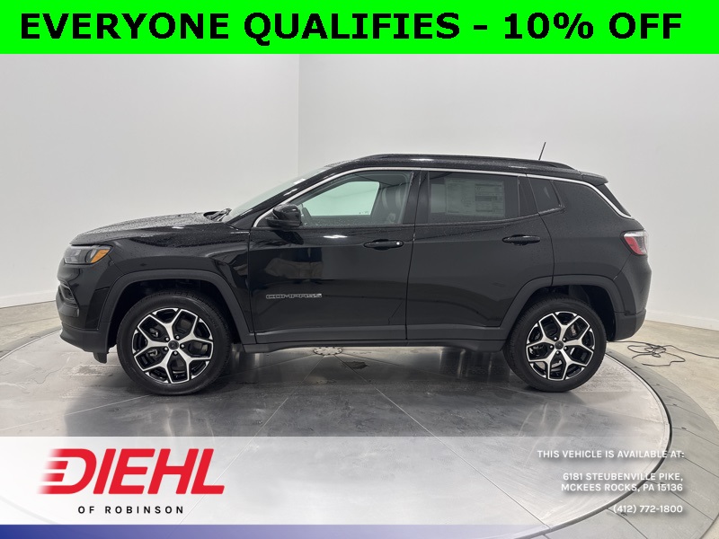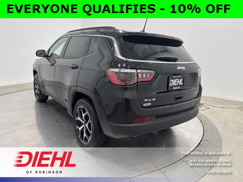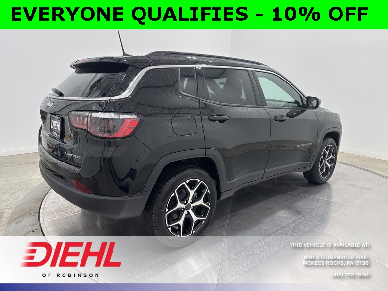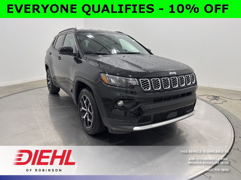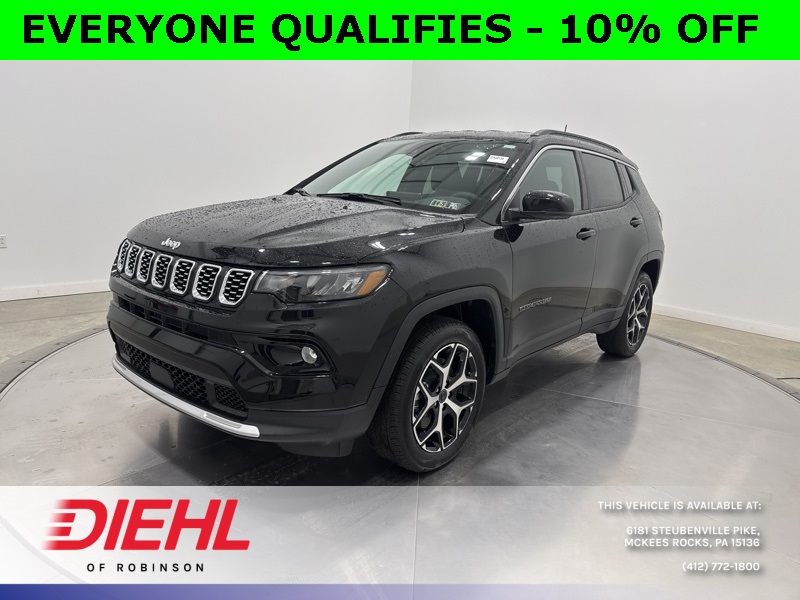 Quick Order Package 29G, 4WD, 10.1" Touchscreen Display, 3.73 Final Drive Ratio, 4-Wheel Disc Brakes, 6 Speakers, ABS brakes, Air Conditioning, Alloy wheels, AM/FM radio: SiriusXM, Apple CarPlay/Android Auto, Auto High-beam Headlights, Auto-dimming Rear-View mirror, Automatic temperature control, Brake assist, Bumpers: body-color, Compass, Delay-off headlights, Driver door bin, Driver vanity mirror, Dual front impact airbags, Dual front side impact airbags, Electronic Stability Control, Emergency communication system: Jeep Connect, Four wheel independent suspension, Front anti-roll bar, Front Bucket Seats, Front Center Armrest w/Storage, Front dual zone A/C, Front fog lights, Front License Plate Bracket, Front reading lights, Fully automatic headlights, Heated door mirrors, Heated front seats, Illuminated entry, Knee airbag, Leather Shift Knob, Leather steering wheel, Leatherette Seats, Low tire pressure warning, Occupant sensing airbag, Outside temperature display, Overhead airbag, Overhead console, Panic alarm, ParkView Rear Back-Up Camera, Passenger door bin, Passenger vanity mirror, Power door mirrors, Power driver seat, Power steering, Power windows, Premium audio system: UConnect 5, Radio: Uconnect 5 w/10.1" Display, Rain sensing wipers, Rear anti-roll bar, Rear seat center armrest, Rear window defroster, Rear window wiper, Remote keyless entry, Security system, Speed control, Split folding rear seat, Spoiler, Steering wheel mounted audio controls, Tachometer, Telescoping steering wheel, Tilt steering wheel, Traction control, Trip computer, Turn signal indicator mirrors, Variably intermittent wipers, and Wheels: 18" x 7" Painted Diamond Cut Alum (DISC) 4WD. Recent Arrival! Diamond Black Crystal Pearlcoat 2025 Jeep Compass Limited 4WD 8-Speed Automatic 2.0L I4 DOHC