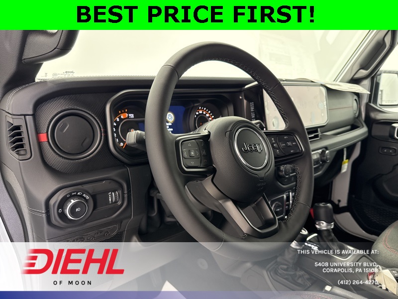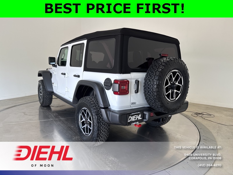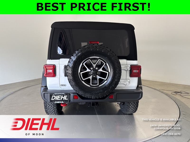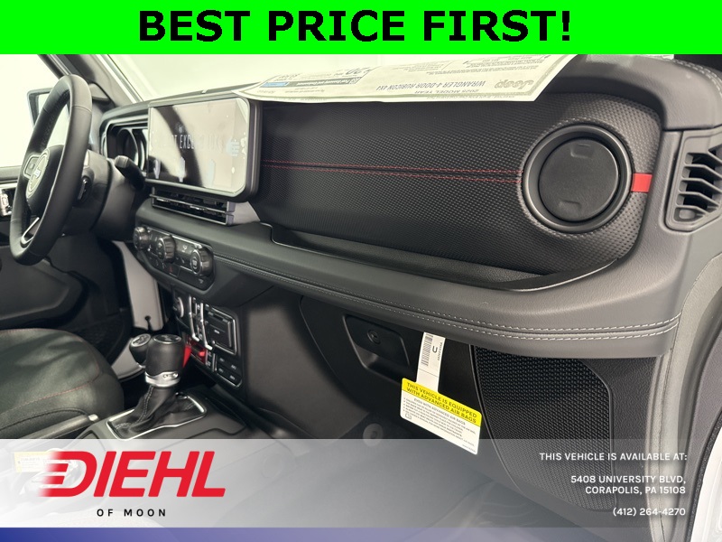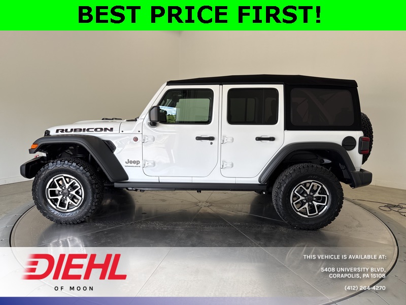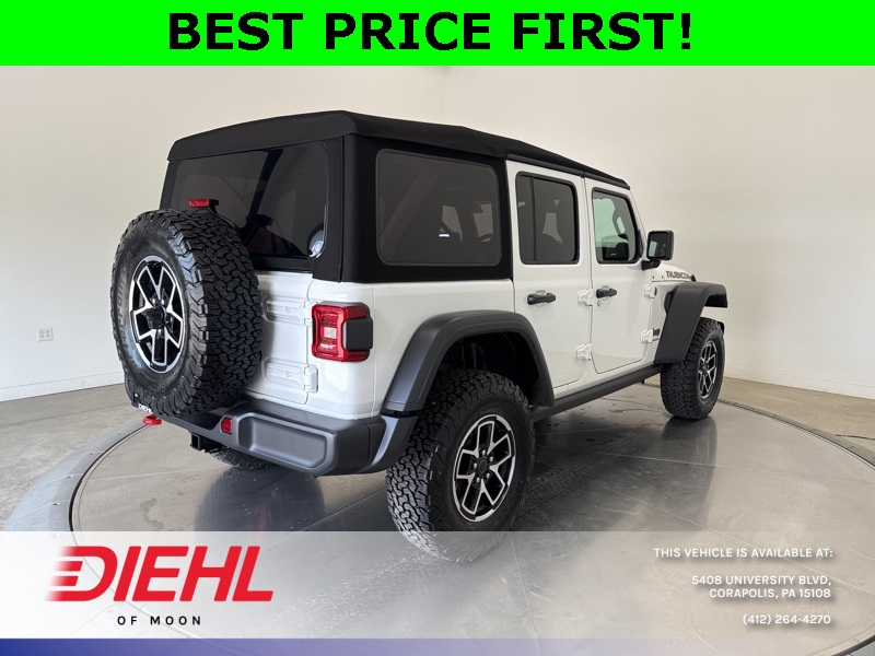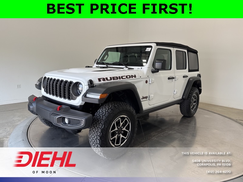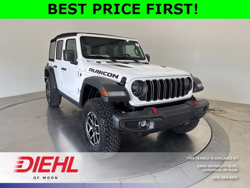 Welcome to the top of the Jeep food chain. The 2025 Jeep Wrangler 4-Door Rubicon 4x4 is more than just a new SUV for sale near Pittsburgh its an all-terrain war machine disguised as a daily driver. Available now at Diehl Chrysler Dodge Jeep Ram in Moon Township, PA, this Bright White beast is ready to crawl rocks, ford rivers, and conquer commutes with the same energy.Under the hood? The tried-and-true 3.6L V6 engine with Stop/Start, paired with an 8-speed automatic transmission. But this isnt your average Wrangler this is the Rubicon, which means youre rolling with a 4:1 Rock-Trac heavy-duty part-time 4WD system, third-gen Dana 44 front axle, and full-float Dana M220 rear axle. Tru-Lok front and rear lockers. Performance suspension. Off-road plus mode. Its not trail-rated by accident its trail-built by obsession.Inside, its high-tech meets high ground clearance. A massive 12.3-inch Uconnect touchscreen, Apple CarPlay, Android Auto, Jeep Connect trial services, SiriusXM, a Wi-Fi hotspot, and premium soft-touch surfaces make sure your roughest rides are still comfortably connected. Heated front seats, heated steering wheel, and remote start? Standard on this monster thanks to the Customer Preferred Package 24R.And because style still matters when youre blasting through mud, this Wrangler Rubicon comes with a premium black Sunrider soft top, 17-inch black machined wheels, and LT285/70R17C off-road tires that bite harder than your ex's lawyer. LED premium reflector headlamps, LED fogs, tail lamps, and signature accents make sure you're seen even when youre ghosting civilization deep in the woods.Safetys covered too. Full-speed forward collision warning, adaptive cruise with stop, rear backup camera, blind-spot detection, and enough airbags to make your insurance agent blush.Priced at $59,805 and backed by Jeeps 5-year/60,000-mile powertrain warranty, this 2025 Jeep Wrangler Rubicon 4x4 is the ultimate weapon for Western PA explorers. Whether you're crawling in Connellsville or hitting potholes like moguls in Robinson, this Wrangler is built to dominate.Come test drive the 2025 Rubicon at Diehl Jeep in Moon Township minutes from Pittsburgh, and miles beyond ordinary. But move fast. Rubicons dont sit still for long... and neither should you.