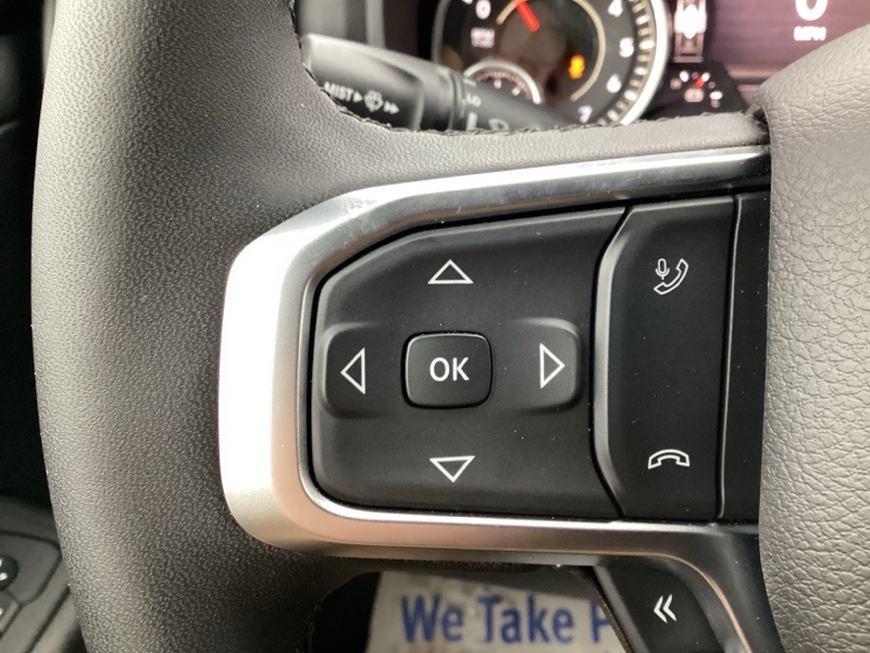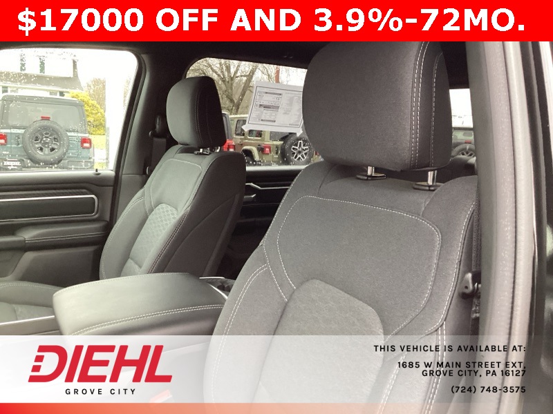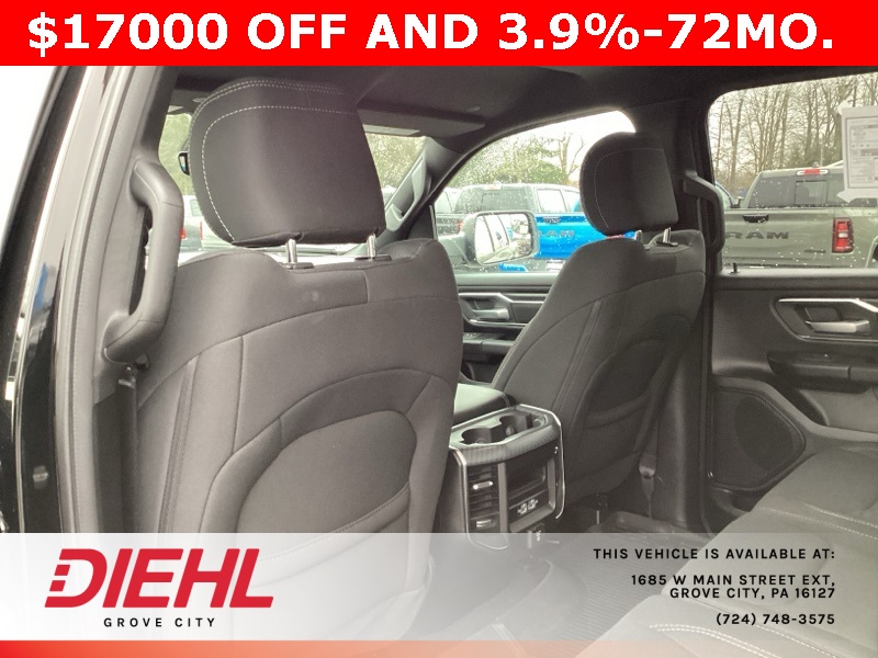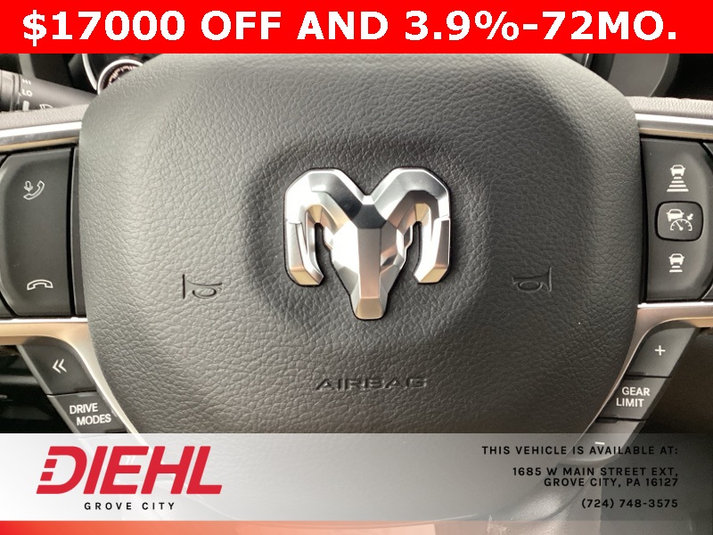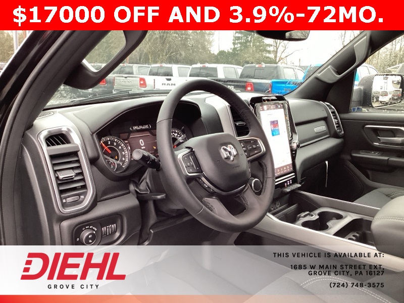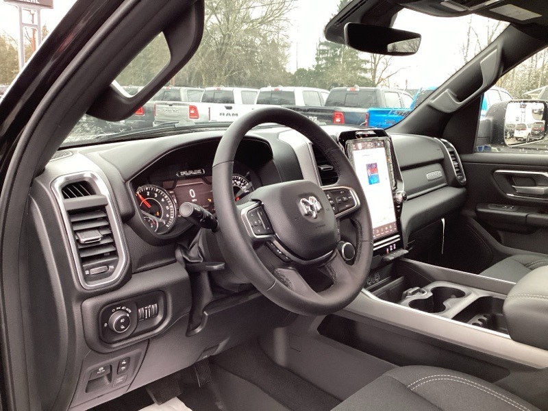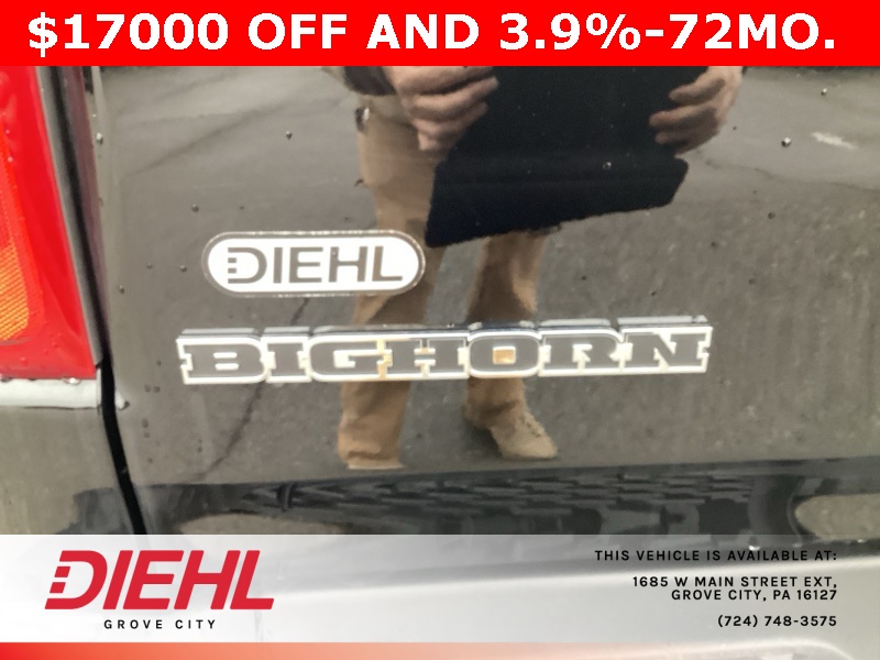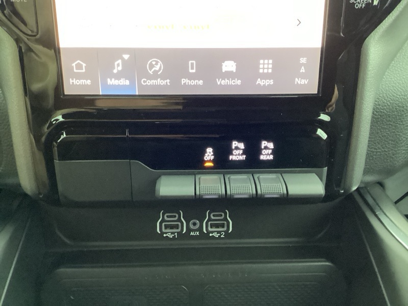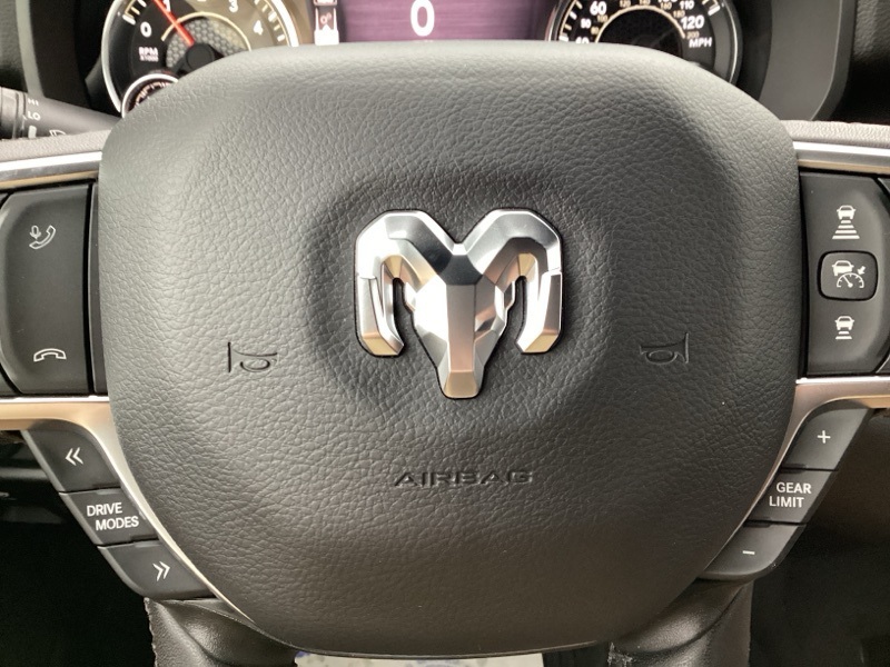 115V Auxiliary Power Outlet, 115V Auxiliary Rear Power Outlet, 12" Touchscreen Display, 2nd Row In Floor Storage Bins, 3 Rear Seat Head Restraints, 3.21 Rear Axle Ratio, 4 Way Front Headrests, 400W Inverter, 4G LTE Wi-Fi Hot Spot, 9 Amplified Speakers w/Subwoofer, Air Conditioning ATC w/Dual Zone Control, Apple CarPlay, Auto Power-Folding Mirrors, Auto-Dimming Exterior Driver Mirror, Auto-Dimming Rear-View Mirror, Bed Utility Group, Big Horn Badge, Big Horn Level 2 Equipment Group, Black Exterior Mirrors, Black Interior Accents, Black Premium Power Mirrors, Body Color Door Handles, Body Color Front Bumper, Body Color Rear Bumper w/Step Pads, Body Color Tailgate Handle, Bucket Seats, Cluster 7.0" TFT Color Display, Configurable Drive Mode, Connected Travel & Traffic Services, Connectivity - US/Canada, Convex Wide-Angle Exterior Mirror Insert, Deluxe Cloth Bucket Seats, Exterior 115V AC Outlet, Exterior Mirrors Courtesy Lamps, Exterior Mirrors w/Heating Element, Exterior Mirrors w/Supplemental Signals, Front Seat Back Map Pockets, Full Length Floor Console, Glove Box Lamp, Google Android Auto, GPS Antenna Input, GPS Navigation, Grille Surround 1 Body Color Texture 1 Black, HD Radio, Heated Front Seats, Heated Steering Wheel, Integrated Voice Command w/Bluetooth, Leather Wrapped Steering Wheel, LED Dome Lamp w/On/Off Switch, LED Footwell Lighting, Manual Adjust 4-Way Front Passenger Seat, Media Hub w/2 Charge Only USBs, MOPAR 4 Adjustable Cargo Tie-Down Hooks, MOPAR Spray In Bedliner, Overhead LED Lamps, ParkView Rear Back-Up Camera, Pick-Up Box Lighting, Power 2-Way Driver Lumbar Adjust, Power Adjust 8-Way Driver Seat, Power Adjustable Pedals, Premium Overhead Console, Quick Order Package 23Z Big Horn, Radio: Uconnect 5 Nav w/12.0" Display, RAM Grille Badge - Chrome, Rear 60/40 Folding Seat, Rear Center Armrest, Rear Power Sliding Window, Rear Window Defroster, Remote Tailgate Release, Security Alarm, SiriusXM w/360L, Sport Appearance Package, Steering Wheel Mounted Audio Controls, Sun Visors w/Illuminated Vanity Mirrors, Universal Garage Door Opener, USB Host Flip.