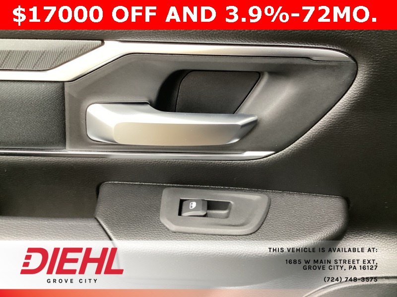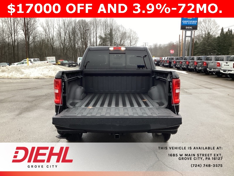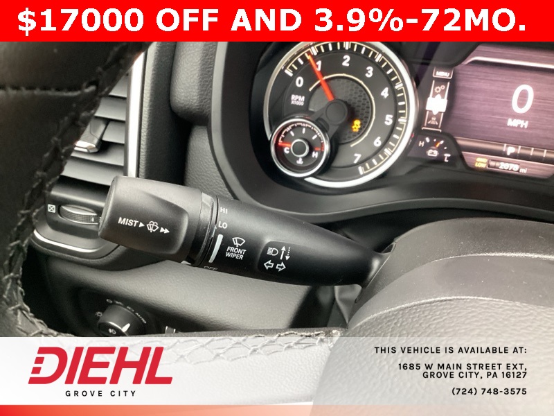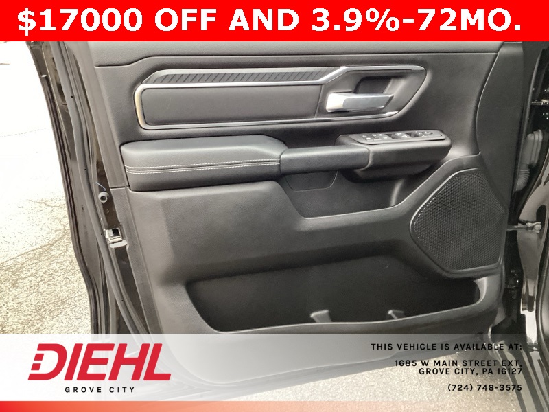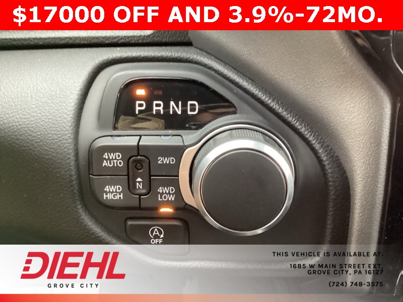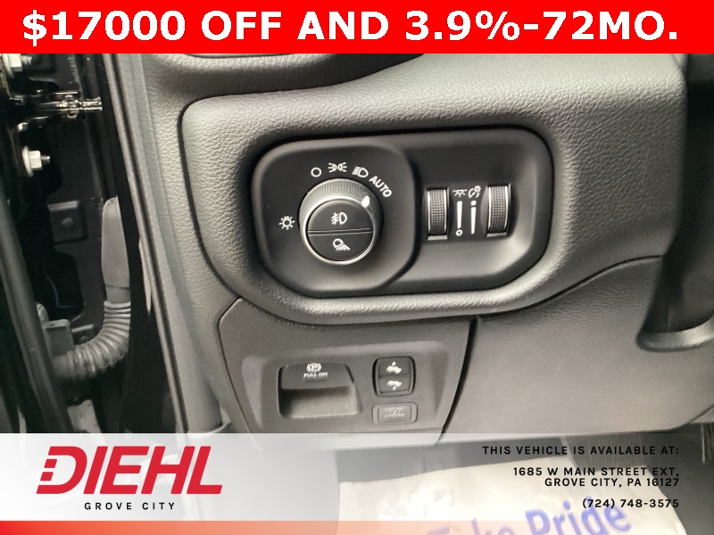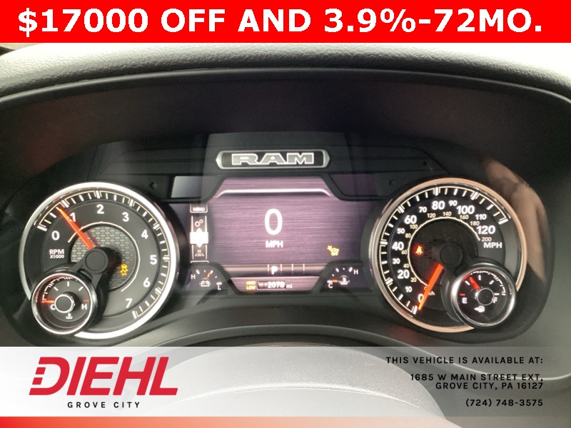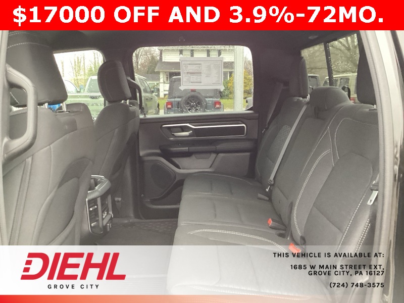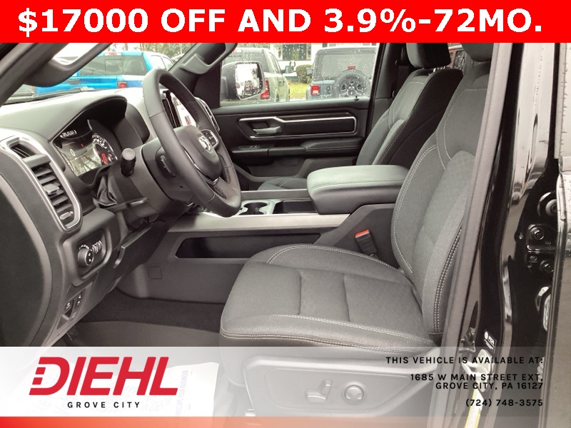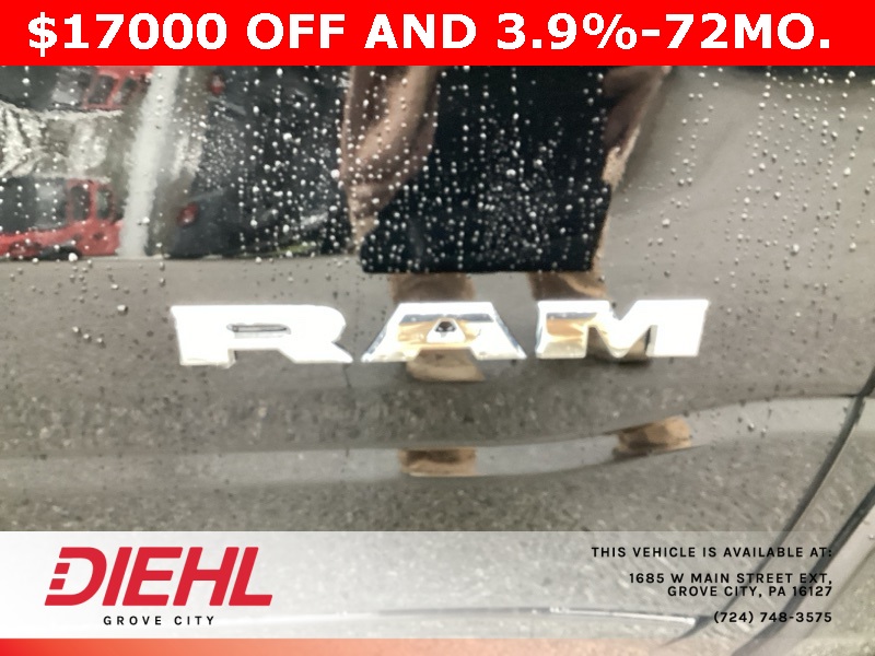 115V Auxiliary Power Outlet, 115V Auxiliary Rear Power Outlet, 12" Touchscreen Display, 2nd Row In Floor Storage Bins, 3 Rear Seat Head Restraints, 3.21 Rear Axle Ratio, 4 Way Front Headrests, 400W Inverter, 4G LTE Wi-Fi Hot Spot, 9 Amplified Speakers w/Subwoofer, Air Conditioning ATC w/Dual Zone Control, Apple CarPlay, Auto Power-Folding Mirrors, Auto-Dimming Exterior Driver Mirror, Auto-Dimming Rear-View Mirror, Bed Utility Group, Big Horn Badge, Big Horn Level 2 Equipment Group, Black Exterior Mirrors, Black Interior Accents, Black Premium Power Mirrors, Body Color Door Handles, Body Color Front Bumper, Body Color Rear Bumper w/Step Pads, Body Color Tailgate Handle, Bucket Seats, Cluster 7.0" TFT Color Display, Configurable Drive Mode, Connected Travel & Traffic Services, Connectivity - US/Canada, Convex Wide-Angle Exterior Mirror Insert, Deluxe Cloth Bucket Seats, Exterior 115V AC Outlet, Exterior Mirrors Courtesy Lamps, Exterior Mirrors w/Heating Element, Exterior Mirrors w/Supplemental Signals, Front Seat Back Map Pockets, Full Length Floor Console, Glove Box Lamp, Google Android Auto, GPS Antenna Input, GPS Navigation, Grille Surround 1 Body Color Texture 1 Black, HD Radio, Heated Front Seats, Heated Steering Wheel, Integrated Voice Command w/Bluetooth, Leather Wrapped Steering Wheel, LED Dome Lamp w/On/Off Switch, LED Footwell Lighting, Manual Adjust 4-Way Front Passenger Seat, Media Hub w/2 Charge Only USBs, MOPAR 4 Adjustable Cargo Tie-Down Hooks, MOPAR Spray In Bedliner, Overhead LED Lamps, ParkView Rear Back-Up Camera, Pick-Up Box Lighting, Power 2-Way Driver Lumbar Adjust, Power Adjust 8-Way Driver Seat, Power Adjustable Pedals, Premium Overhead Console, Quick Order Package 23Z Big Horn, Radio: Uconnect 5 Nav w/12.0" Display, RAM Grille Badge - Chrome, Rear 60/40 Folding Seat, Rear Center Armrest, Rear Power Sliding Window, Rear Window Defroster, Remote Tailgate Release, Security Alarm, SiriusXM w/360L, Sport Appearance Package, Steering Wheel Mounted Audio Controls, Sun Visors w/Illuminated Vanity Mirrors, Universal Garage Door Opener, USB Host Flip.
