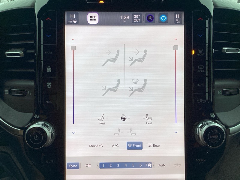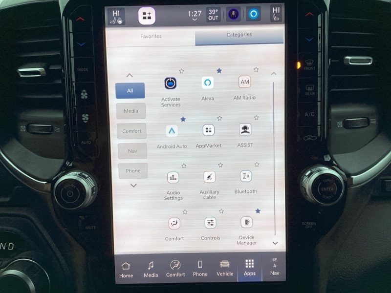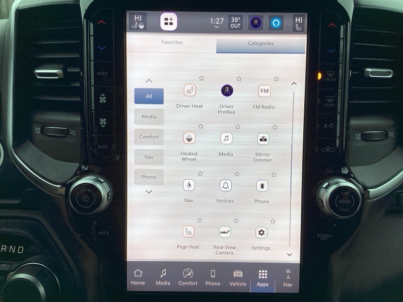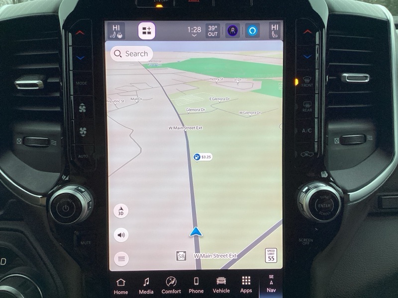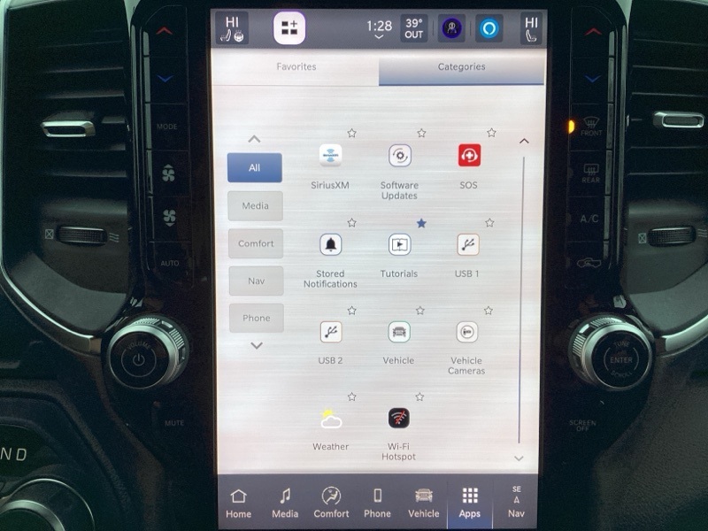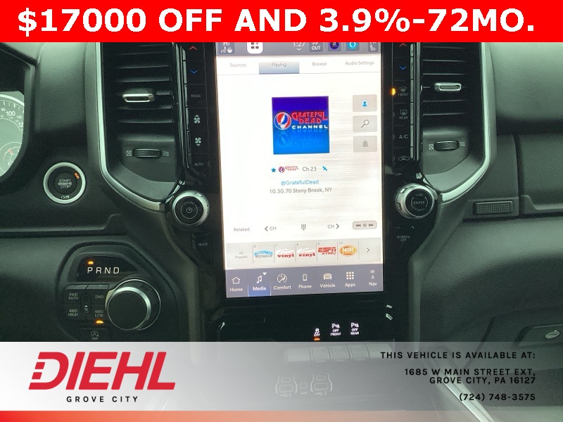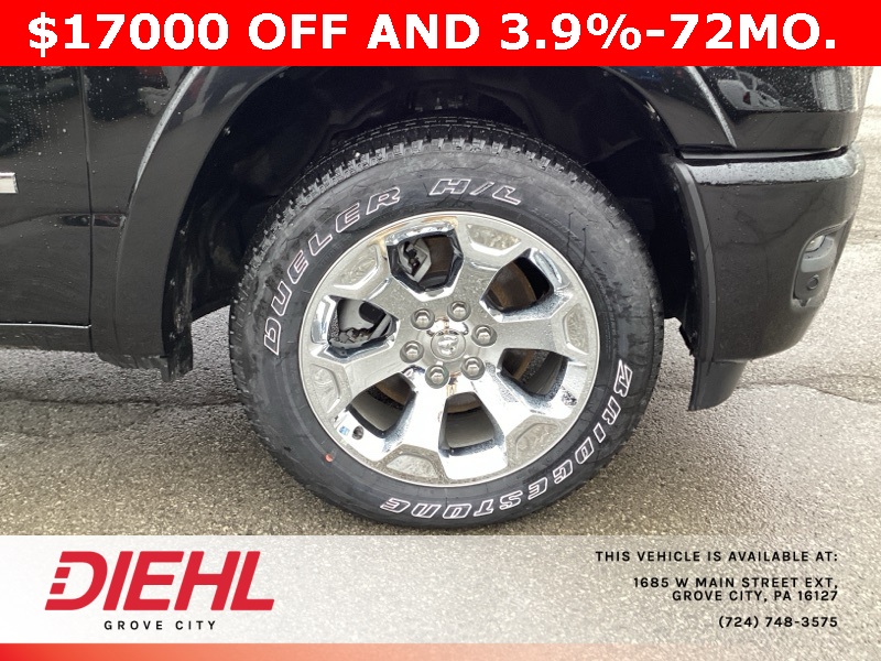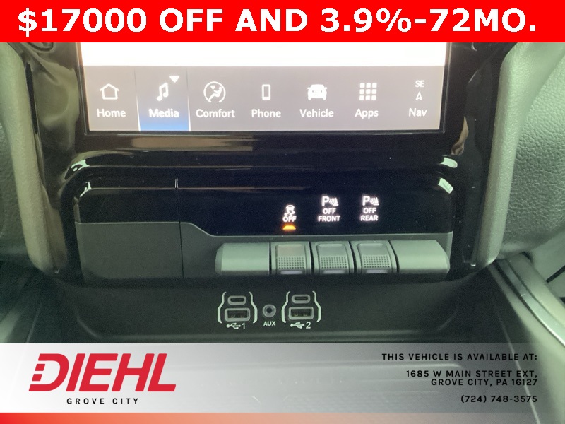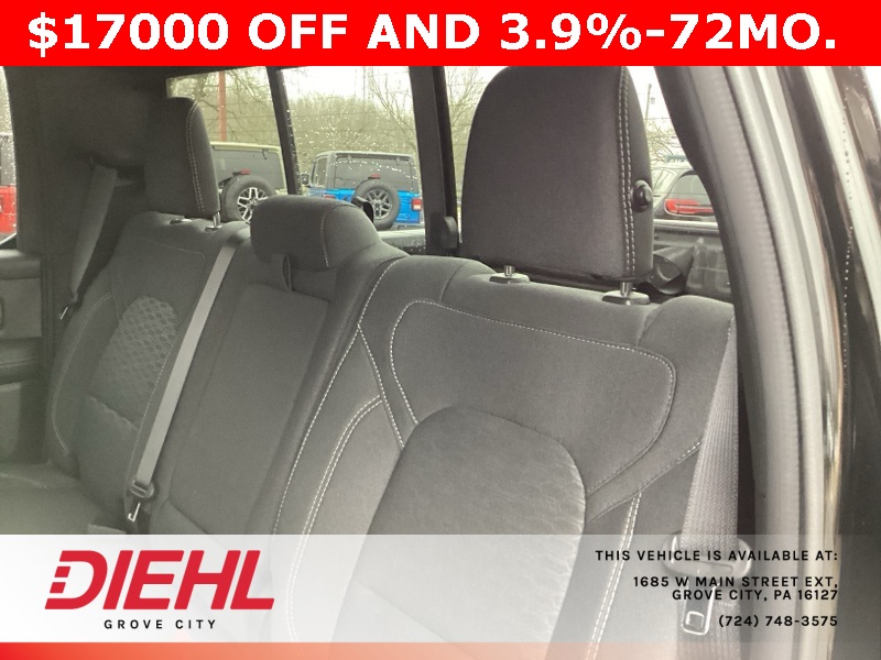 115V Auxiliary Power Outlet, 115V Auxiliary Rear Power Outlet, 12" Touchscreen Display, 2nd Row In Floor Storage Bins, 3 Rear Seat Head Restraints, 3.21 Rear Axle Ratio, 4 Way Front Headrests, 400W Inverter, 4G LTE Wi-Fi Hot Spot, 9 Amplified Speakers w/Subwoofer, Air Conditioning ATC w/Dual Zone Control, Apple CarPlay, Auto Power-Folding Mirrors, Auto-Dimming Exterior Driver Mirror, Auto-Dimming Rear-View Mirror, Bed Utility Group, Big Horn Badge, Big Horn Level 2 Equipment Group, Black Exterior Mirrors, Black Interior Accents, Black Premium Power Mirrors, Body Color Door Handles, Body Color Front Bumper, Body Color Rear Bumper w/Step Pads, Body Color Tailgate Handle, Bucket Seats, Cluster 7.0" TFT Color Display, Configurable Drive Mode, Connected Travel & Traffic Services, Connectivity - US/Canada, Convex Wide-Angle Exterior Mirror Insert, Deluxe Cloth Bucket Seats, Exterior 115V AC Outlet, Exterior Mirrors Courtesy Lamps, Exterior Mirrors w/Heating Element, Exterior Mirrors w/Supplemental Signals, Front Seat Back Map Pockets, Full Length Floor Console, Glove Box Lamp, Google Android Auto, GPS Antenna Input, GPS Navigation, Grille Surround 1 Body Color Texture 1 Black, HD Radio, Heated Front Seats, Heated Steering Wheel, Integrated Voice Command w/Bluetooth, Leather Wrapped Steering Wheel, LED Dome Lamp w/On/Off Switch, LED Footwell Lighting, Manual Adjust 4-Way Front Passenger Seat, Media Hub w/2 Charge Only USBs, MOPAR 4 Adjustable Cargo Tie-Down Hooks, MOPAR Spray In Bedliner, Overhead LED Lamps, ParkView Rear Back-Up Camera, Pick-Up Box Lighting, Power 2-Way Driver Lumbar Adjust, Power Adjust 8-Way Driver Seat, Power Adjustable Pedals, Premium Overhead Console, Quick Order Package 23Z Big Horn, Radio: Uconnect 5 Nav w/12.0" Display, RAM Grille Badge - Chrome, Rear 60/40 Folding Seat, Rear Center Armrest, Rear Power Sliding Window, Rear Window Defroster, Remote Tailgate Release, Security Alarm, SiriusXM w/360L, Sport Appearance Package, Steering Wheel Mounted Audio Controls, Sun Visors w/Illuminated Vanity Mirrors, Universal Garage Door Opener, USB Host Flip.