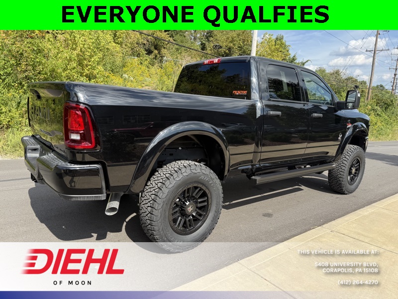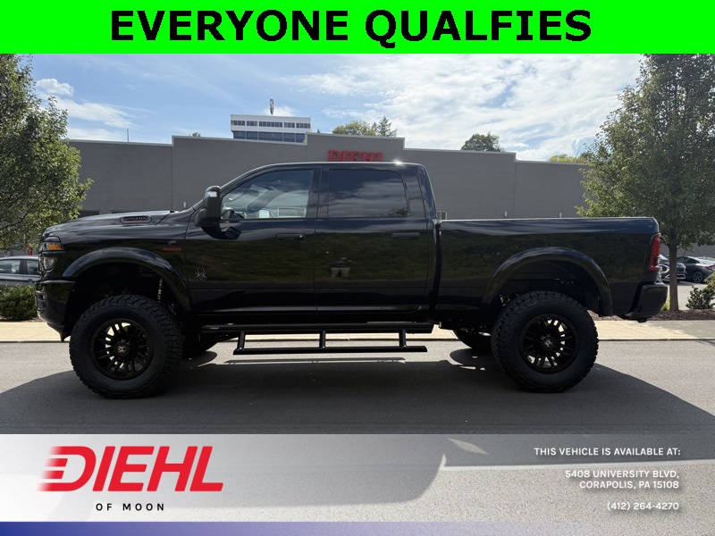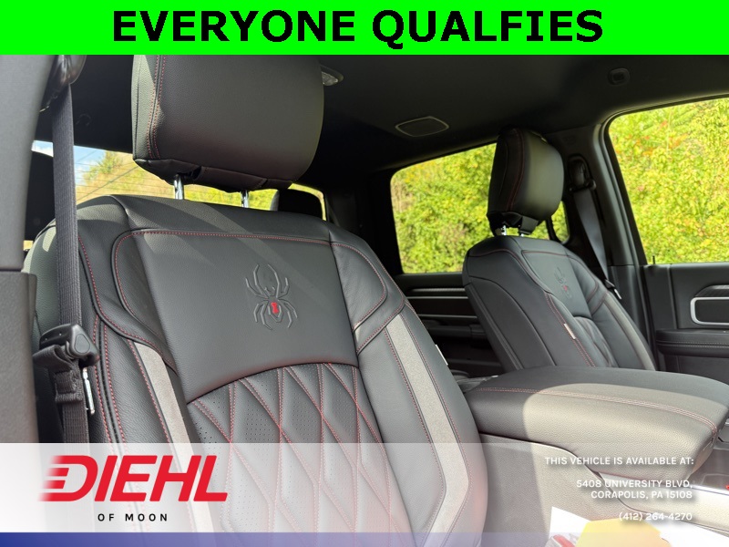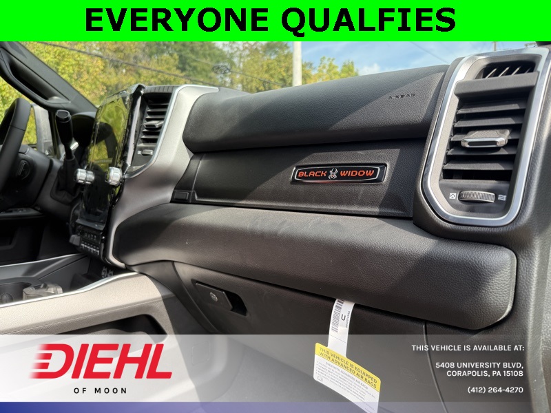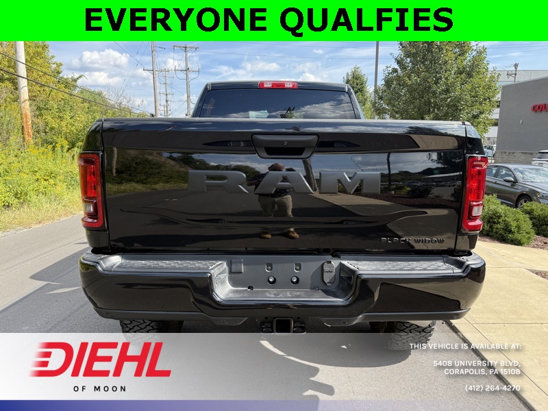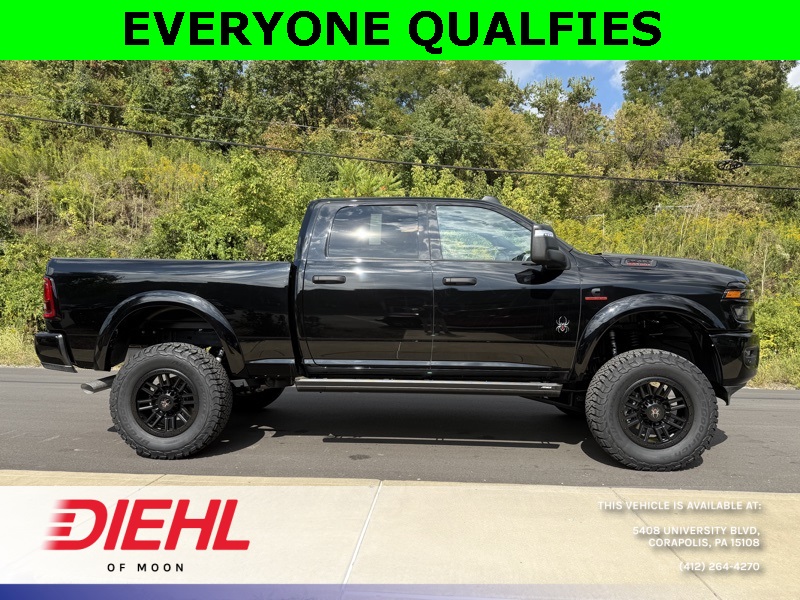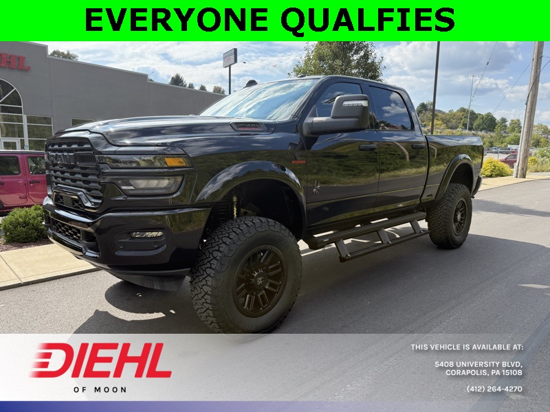 If you've been hunting for a truck that looks like it just bench-pressed a bulldozer and then polished its boots, meet the 2025 Ram 2500 Big Horn Crew Cab Black Widow Edition. This beast, available now at Diehl of Moon, blends legendary Ram strength with the sinister swagger of a Black Widow custom upfit. Cloaked in Diamond Black Crystal Pearl-Coat paint and wearing 20-inch black off-road wheels wrapped in 37-inch premium all-terrain tires, this heavy-duty pickup doesn't just roll into Pittsburgh.. it owns the road like its auditioning for a superhero film.Under the hood, the 6.7L Cummins Turbo Diesel engine flexes its muscle with the kind of torque that makes towing a yacht feel like pulling a wagon. Paired with an 8-speed automatic transmission, its smooth when you want it and ferocious when you need it. A 4-inch suspension lift system elevates your game,literally, giving you commanding views of Moon Township traffic while letting everyone else know they're in the presence of greatness. Add power running boards, body-color smooth fender flares, and Black Widow badging, and you've got a truck that's as much a lifestyle statement as it is a workhorse.Inside, custom leather seating, red LED interior lighting, and a 12-inch Uconnect touchscreen with navigation and Harman Kardon sound make this rig part luxury lounge, part command center. Whether you're hauling gear, heading to the job site, or cruising the backroads of Western PA, you'll appreciate the heated seats, all-weather floor mats, and safety tech that keeps confidence as high as the lift kit.If you're searching for the best new truck deals near Moon Township PA or a Ram 2500 dealership in Western PA that delivers pure power with premium style, your search ends here. The 2025 Ram 2500 Big Horn Black Widow is not just for sale in Pittsburgh, its waiting to conquer it. Come see us today at Diehl of Moon and take the test drive that might just ruin you for every other truck on the planet.Disclaimer:New vehicle pricing includes all offers and incentives. Tax, Title and Tags not included in vehicle prices shown and must be paid by the purchaser. While great effort is made to ensure the accuracy of the information on this site, errors do occur so please verify information with a customer service rep. This is easily done by calling us at (412)-264-4270 or by visiting us at the dealership.All pricing and details are believed to be accurate, but we do not warrant or guarantee such accuracy. The prices shown above, may vary from region to region, as will incentives, and are subject to change. Vehicle information is based off standard equipment and may vary from vehicle to vehicle. Call or email for complete vehicle specific information. Price includes: $2000 - 2025 National Bonus Cash . Exp. 09/30/2025 $2,000 - Exp. 10/01/2025 Price includes $22,393 of dealer added accessories.