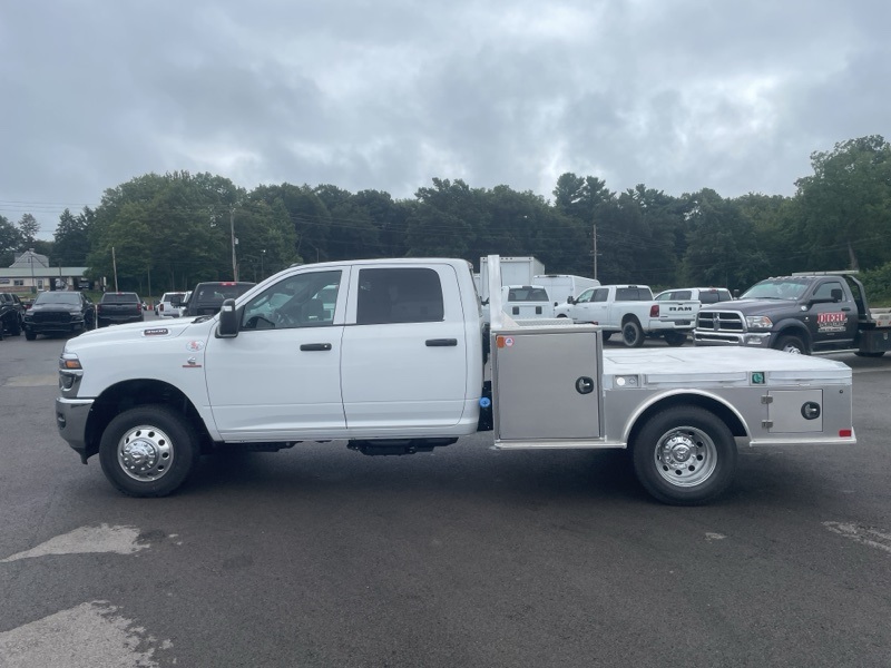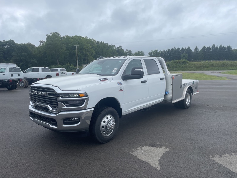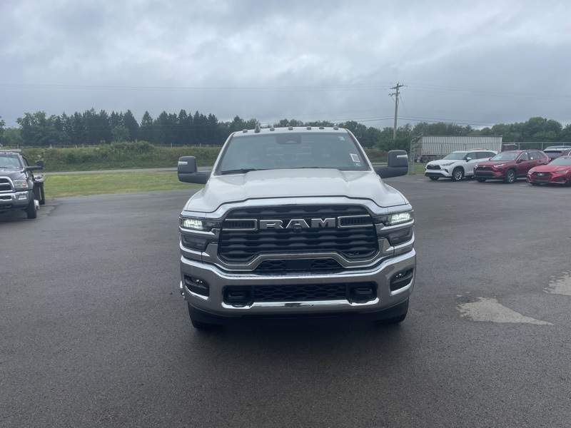 Chrome Appearance Group (Bright Front Bumper, Center Hub, Chrome Grille Surround, Matte Black Mesh Grille w/Chrome, and Wheels: 18" x 8.0" Polished Aluminum), Cold Weather Group (Engine Block Heater and MOPAR Winter Front Grille Cover), Quick Order Package 25A Tradesman, Tradesman Level 1 Equipment Group (Black Exterior Mirrors, Black Power Heated Fold Telescope Mirrors, Exterior Mirrors Courtesy Lamps, Exterior Mirrors w/Heating Element, Exterior Mirrors w/Supplemental Signals, Manual Folding Exterior Mirrors, Manual Telescoping Mirrors, Mirror Running Lights, Power Adjust Mirrors, Power-Adjustable Convex Aux Mirrors, Rear Window Defroster, Trailer Brake Control, and Trailer Light Check), 11.50" Dual Wheels Rear Axle, 2 Way Rear Headrest Seat, 4-Wheel Disc Brakes, 40/20/40 Split Bench Seat, 4G LTE Wi-Fi Hot Spot, 6 Speakers, 6000# Front Axle w/Hub Ext, ABS brakes, Air Conditioning, AM/FM radio: SiriusXM, Apple CarPlay, Apple CarPlay/Android Auto, Black Wheel Center Hub, Cargo & CHMSL Lamp, Compass, Connectivity - US/Canada, Delay-off headlights, Driver door bin, Dual front impact airbags, Dual Rear Wheels, Electronic Stability Control, Emergency communication system: RAM Connect, For Details, Visit DriveUconnect.com, Front anti-roll bar, Front Armrest w/Cupholders, Front Center Armrest w/Storage, Front fog lights, Front License Plate Bracket, Front reading lights, Fully automatic headlights, Global Telematics Box Module (TBM), Google Android Auto, GPS Antenna Input, HD Vinyl 40/20/40 Split Bench Seat, Illuminated entry, Integrated Voice Command w/Bluetooth, Manual Adjust 4-Way Driver Seat, Manual Adjust 4-Way Front Passenger Seat, Occupant sensing airbag, Outside temperature display, Overhead console, Panic alarm, ParkView Rear Back-Up Camera, Passenger door bin, Passenger vanity mirror, Power steering, Power windows, Radio data system, Radio: Uconnect 5 w/8.4" Display, Rear anti-roll bar, Rear Folding Seat, Remote keyless entry, Remote USB Port - Charge Only, Speed control, Storage Tray, Tachometer, Temperature & Compass Gauge, Tilt steering wheel, Traction control, Variably intermittent wipers, Voltmeter, Wheels: 17" x 6.0" Polished Aluminum, and Wheels: 18" x 8.0" Steel PainteD. Bright White Clearcoat 2025 Ram 3500 Tradesman 4WD 8-Speed Automatic Cummins 6.7L I6 Turbodiesel