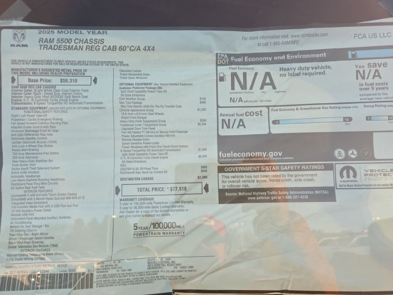 Finished in Bright White Clearcoat and riding on 19.5-inch black painted steel wheels, this Ram 5500HD Tradesman is configured for reliable towing, upfitting, and year-round commercial use.