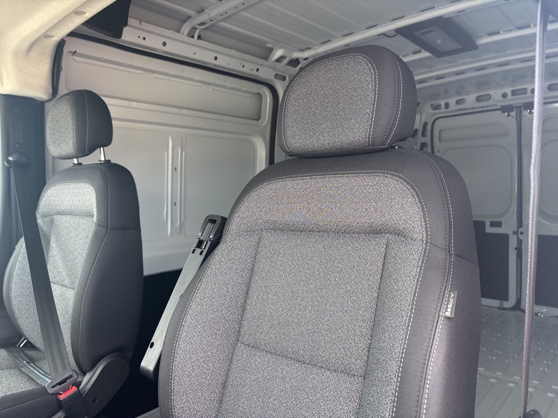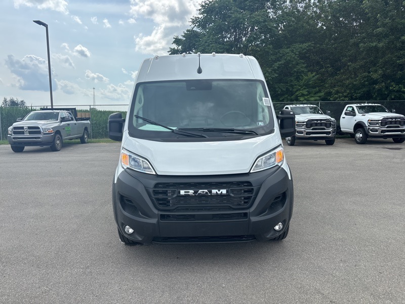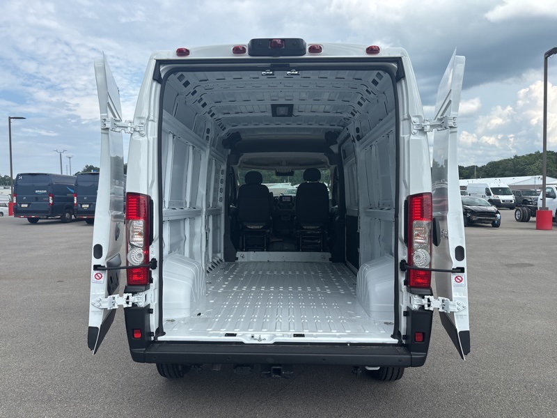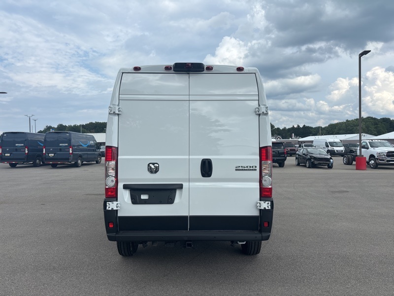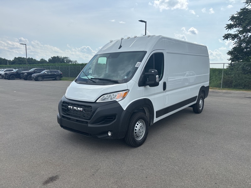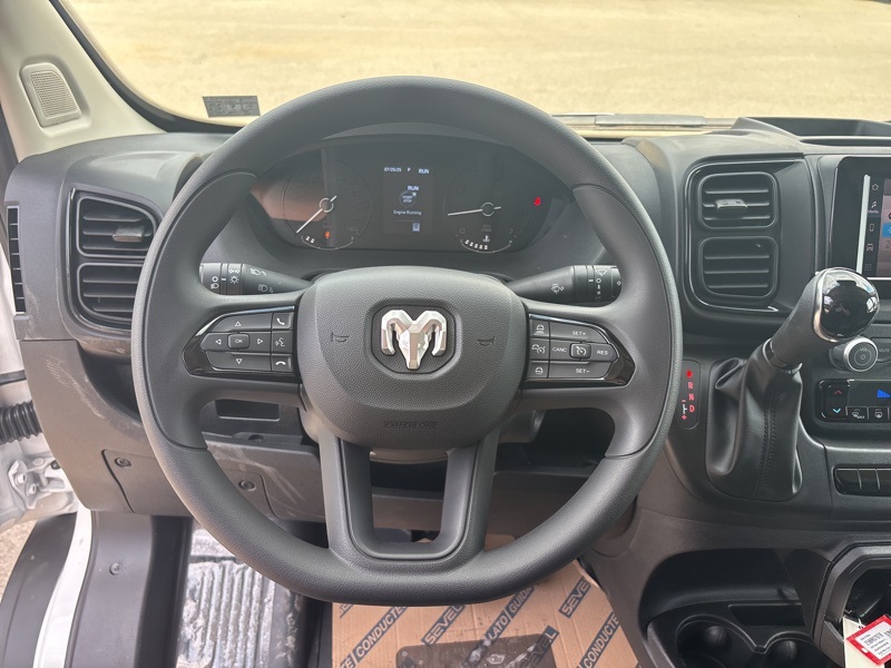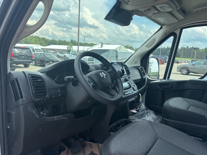 Convenience Group (Exterior Mirrors w/Heating Element, Exterior Mirrors w/Supplemental Signals, Front Fog Lamps, Power Adjust Mirrors, Power Folding/Heated Mirrors, Power-Adjustable Convex Aux Mirrors, Power-Folding Mirrors, and Rear Cargo LED Lamp), Power Group (100 Amp Battery, 115V Auxiliary Power Outlet, and 12V Rear Auxiliary Power Outlet), Quick Order Package 22B Tradesman w/Pass Seat (4-Way Manual Adjust Front Passenger Seat and Passenger Bucket Seat), Storage Group (Cargo Net, Shelf Above Roof Trim, and Underseat Storage Tray), 4 Speakers, 4-Wheel Disc Brakes, 4.08 Axle Ratio, 4G LTE Wi-Fi Hotspot, ABS brakes, Adaptive Cruise Control w/Stop & Go, Air Conditioning, AM/FM radio: SiriusXM, Apple CarPlay, Apple CarPlay/Android Auto, Black/Gray Seats, Bodyside moldings, Brake assist, Class IV Receiver Hitch, Cloth Bucket Seats, Connectivity - US/Canada, Driver door bin, Driver Seat Armrest, Driver's Seat Mounted Armrest, Electronic Stability Control, For Details, Visit DriveUconnect.com, For More Info, Call 800-643-2112, Front anti-roll bar, Front Bucket Seats, Front License Plate Bracket, Front reading lights, Front wheel independent suspension, Global Telematics Box Module (TBM), Google Android Auto, GPS Antenna Input, Heavy Duty Suspension, Illuminated entry, Low tire pressure warning, Outside temperature display, Overhead airbag, Overhead console, ParkSense Rear Park Assist System, ParkView Rear Back-Up Camera, Passenger door bin, Power steering, Power windows, Radio: Uconnect 5 w/7" Display, Remote keyless entry, SiriusXM Radio Service, Steering wheel mounted audio controls, Tachometer, Telescoping steering wheel, Traction control, Trip computer, Turn signal indicator mirrors, Variably intermittent wipers, Wheel Center Cap, and Wheels: 16" x 6.0" SteeL. Bright White Clearcoat 2025 Ram ProMaster 2500 High Roof FWD 9-Speed 948TE Automatic 3.6L V6 24V VVT