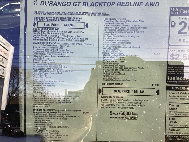 DB Black Crystal Clearcoat 2026 Durango Dodge GT Plus 4D Sport Utility AWD 8-Speed Automatic 3.6L V6 24V VVT Price includes: $1000 - 2026 National Engine Retail Bonus Cash . Exp. 03/31/2026 $500 - 2026 National 2026 First Responder Bonus Cash . Exp. 01/04/2027