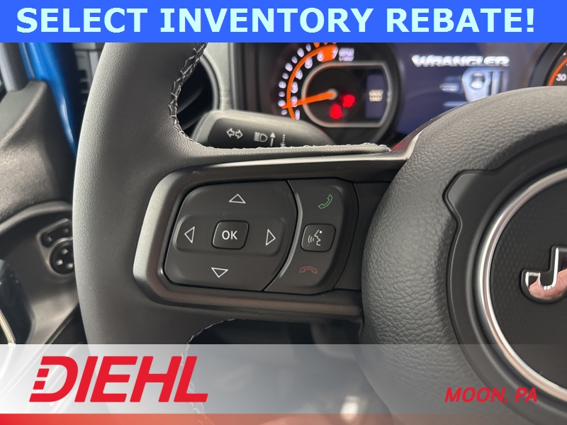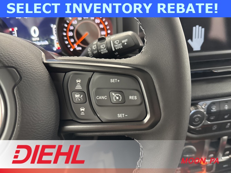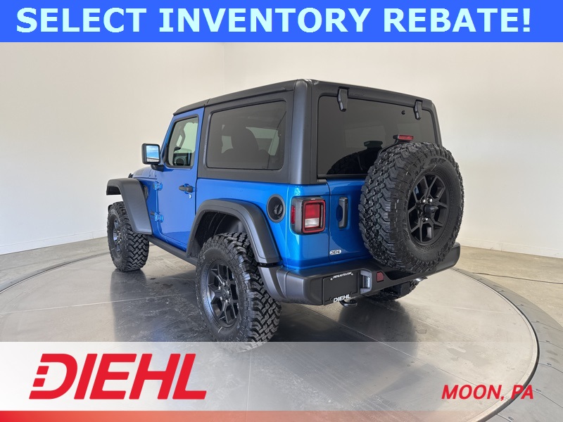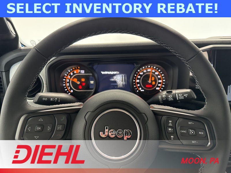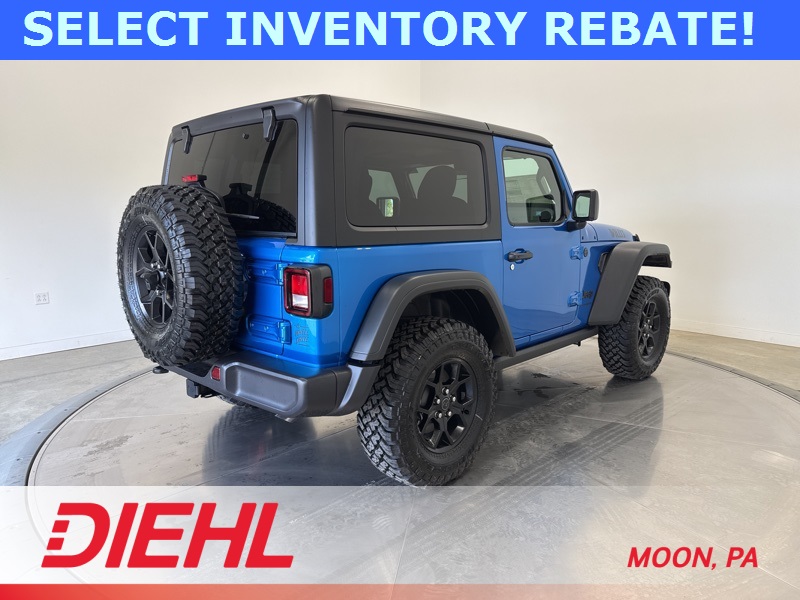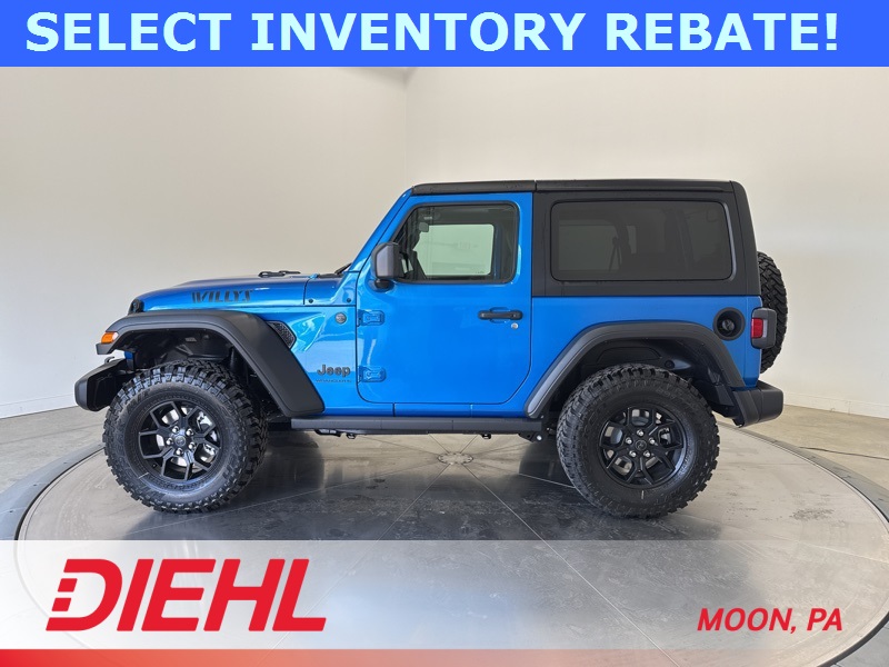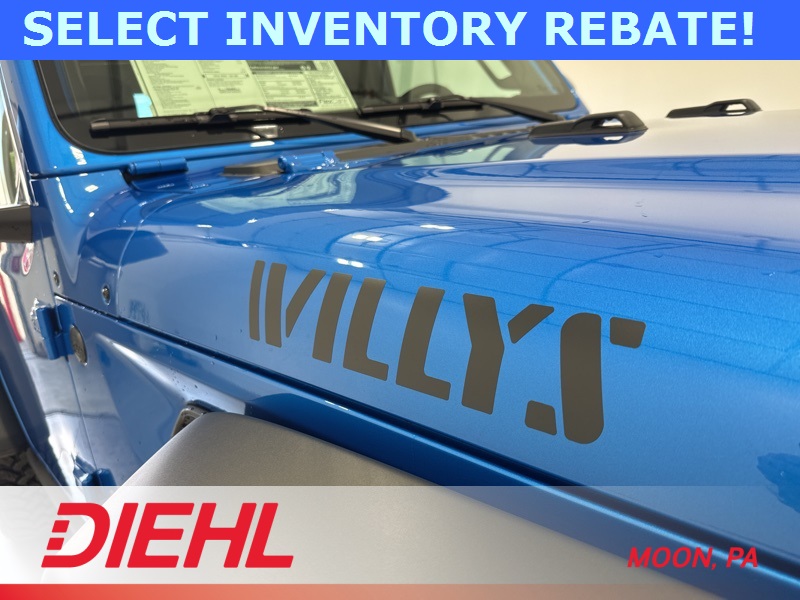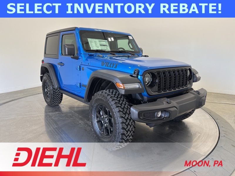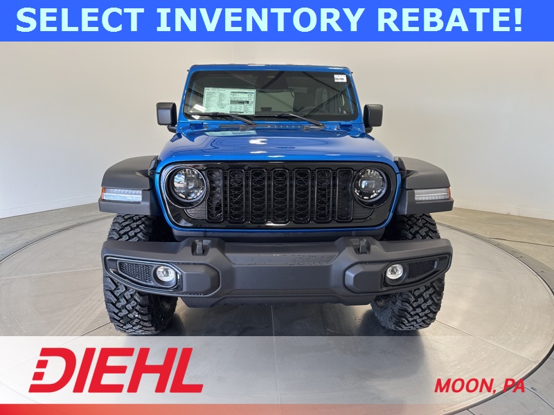 With advanced safety features like Blind Spot Monitoring, Adaptive Cruise Control, and ParkSense Rear Park Assist, this Wrangler makes exploration both thrilling and secure. Whether you are cruising through Moon Township or carving up the trails in Western PA, this new Jeep Wrangler Willys for sale near Pittsburgh is the perfect balance of rugged capability and everyday comfort. Visit Diehl of Moon Chrysler Jeep Dodge Ram in Moon Township PA today for the best new Jeep deals near Pittsburgh and make every drive an adventure. Price includes: $1000 - 2026 National Select Inventory Bonus Cash . Exp. 01/04/2027 $500 - 2026 National 2026 First Responder Bonus Cash . Exp. 01/04/2027
