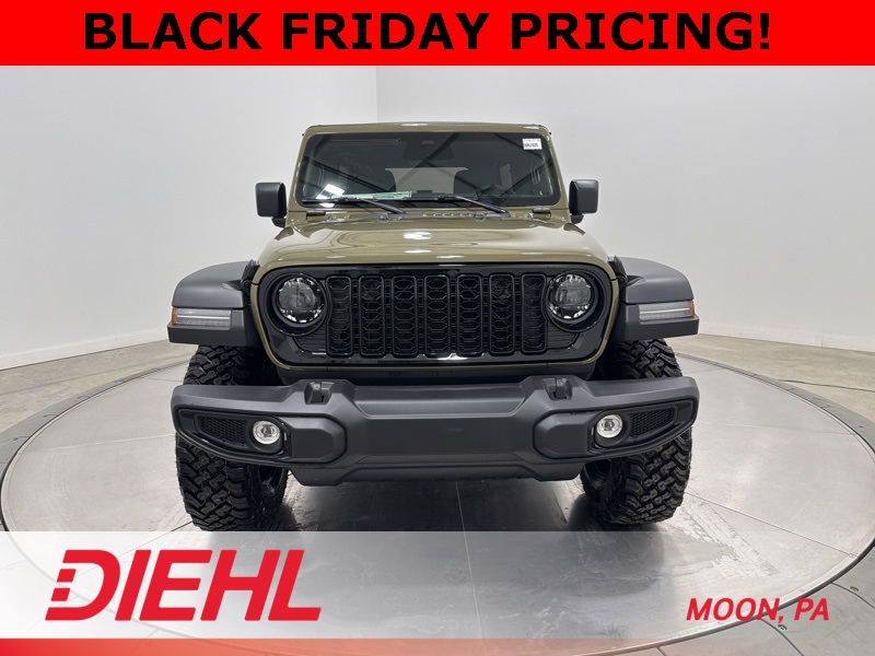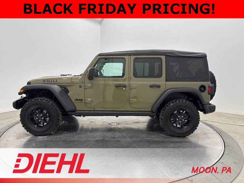With advanced safety features like Blind Spot Monitoring, Adaptive Cruise Control, and ParkSense Rear Park Assist, this Wrangler makes exploration both thrilling and secure. Whether you are cruising through Moon Township or carving up the trails in Western PA, this new Jeep Wrangler Willys for sale near Pittsburgh is the perfect balance of rugged capability and everyday comfort. Visit Diehl of Moon Chrysler Jeep Dodge Ram in Moon Township PA today for the best new Jeep deals near Pittsburgh and make every drive an adventure. Price includes: $1500 - 2026 National Retail Bonus Cash . Exp. 12/01/2025 $1500 - 2026 National Stellantis Loyalty Retail Bonus Cash . Exp. 12/01/2025 $500 - 2026 National 2026 First Responder Bonus Cash . Exp. 01/05/2026