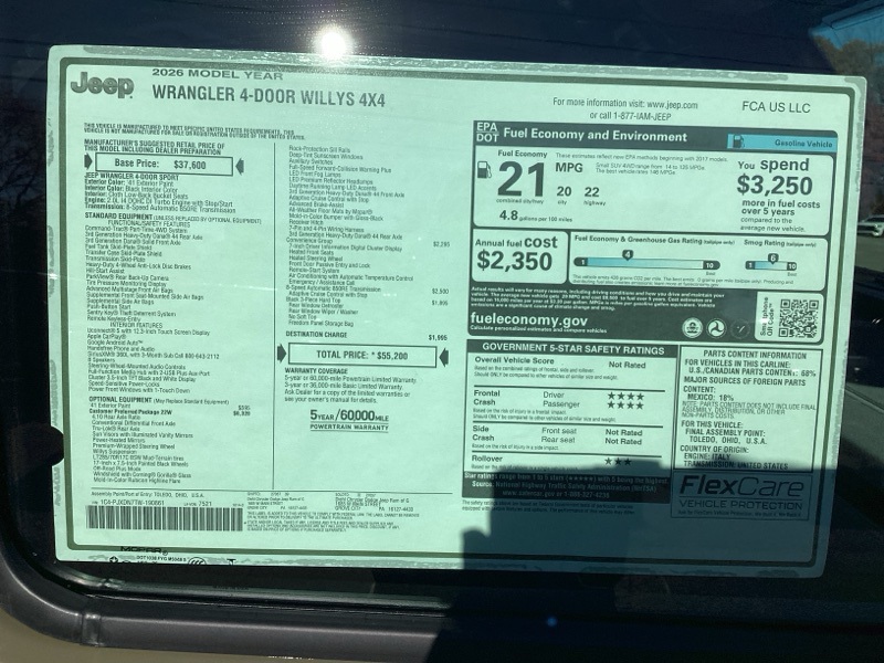 Pj5 2026 Wrangler Jeep Willys 4D Sport Utility 4WD 8-Speed Automatic 2.0L I4 DOHC Price includes: $1500 - 2026 National Retail Bonus Cash . Exp. 12/01/2025