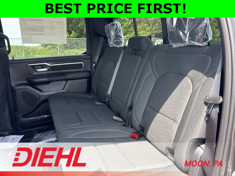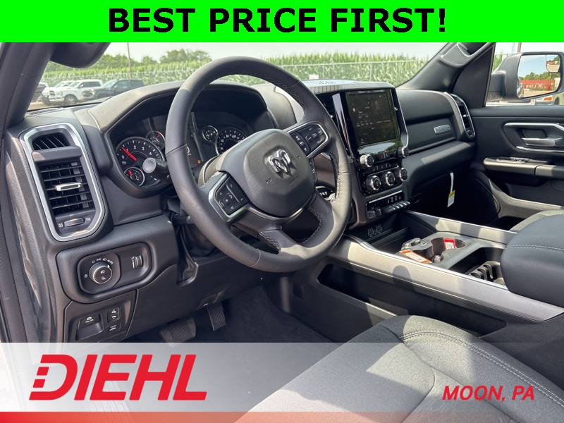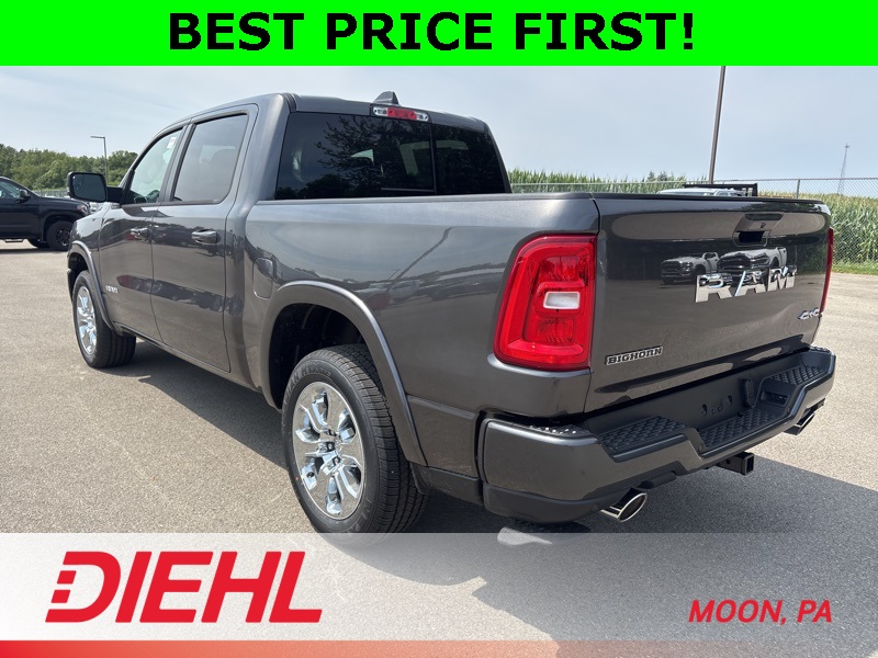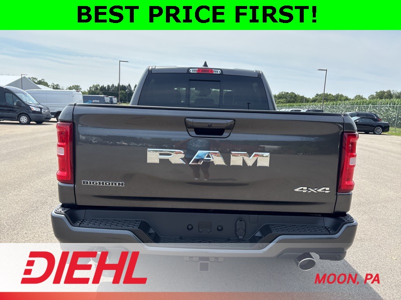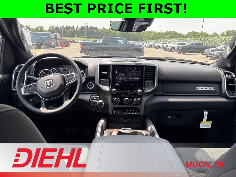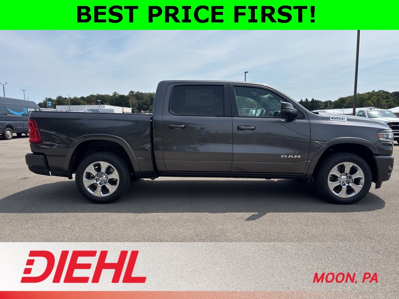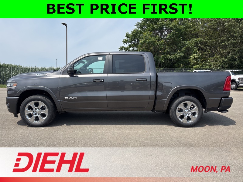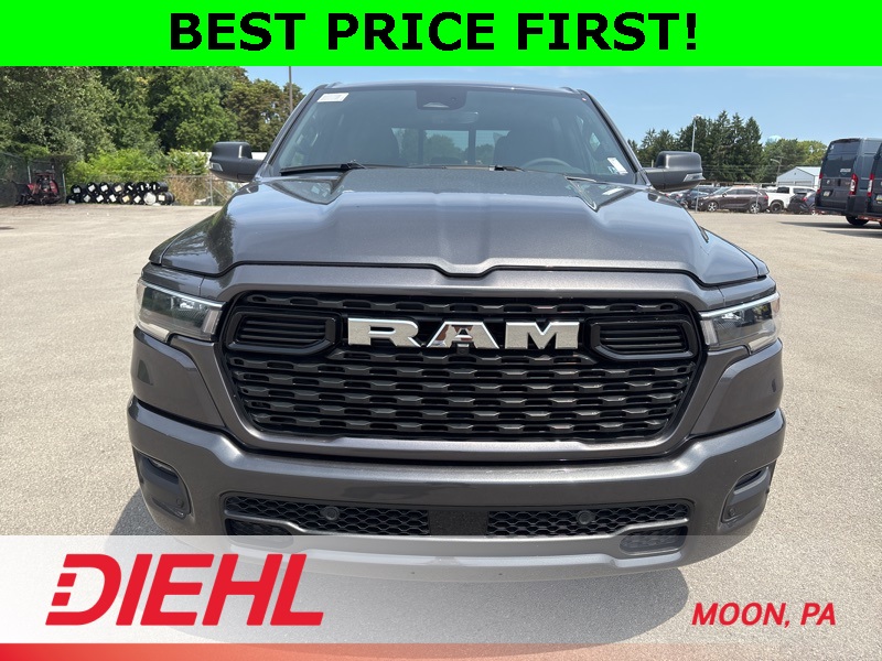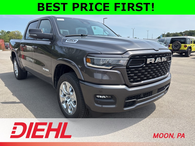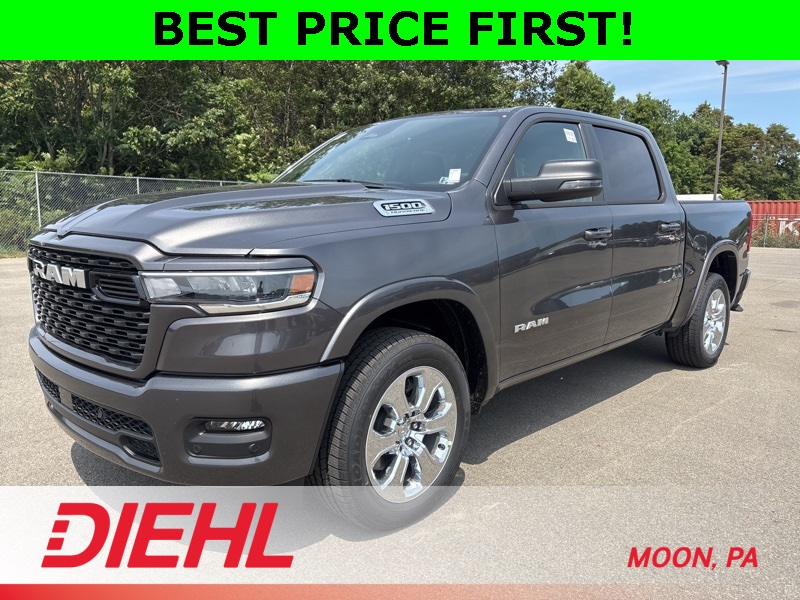 If you've been waiting for a truck that can be both the king of the jobsite and the ruler of Saturday tailgates, let me introduce the 2026 Ram 1500 Big Horn Crew Cab 4x4. Painted in Granite Crystal Metallic and riding high on its rugged stance, this full-size pickup is the perfect balance of brute force and modern refinement, making it the most exciting new Ram 1500 for sale in Pittsburgh.Power comes from the legendary 5.7L HEMI V8 with eTorque, giving you the kind of strength that laughs at trailers and makes highway merges feel like launching a rocket. Paired with an 8-speed automatic transmission, the drive is smoother than a steelworkers storytelling voice at Primantis. With optional Sport Appearance Package 2, chrome accents, dual exhaust tips, and 20-inch wheels, this truck doesn't just arrive, it makes an entrance.Inside, you'll find the Deluxe Cloth bucket seats, a power-adjustable drivers seat, and the Uconnect 5 system with a crisp 12-inch touchscreen. Its packed with features like Apple CarPlay, Android Auto, and a Wi-Fi hotspot, making it part mobile office, part family entertainment hub. Add in advanced safety like Forward Collision Warning, Blind Spot Monitoring, and ParkSense front and rear sensors, and you've got confidence whether you're hauling gear through Moon Township or parallel parking in downtown Pittsburgh.For those chasing the best new truck deals near Moon Township PA, this Ram 1500 Big Horn delivers the lifestyle upgrade you didn't know you needed. From grocery runs to towing boats down the Ohio River, its versatile, stylish, and ready for anything. Visit Diehl of Moon, your trusted Ram 1500 dealership in Western PA, and take this HEMI-powered legend for a spin today before someone else claims it as their own.Disclaimer:New vehicle pricing includes all offers and incentives. Tax, Title and Tags not included in vehicle prices shown and must be paid by the purchaser. While great effort is made to ensure the accuracy of the information on this site, errors do occur so please verify information with a customer service rep. This is easily done by calling us at (412)-264-4270 or by visiting us at the dealership.All pricing and details are believed to be accurate, but we do not warrant or guarantee such accuracy. The prices shown above, may vary from region to region, as will incentives, and are subject to change. Vehicle information is based off standard equipment and may vary from vehicle to vehicle. Call or email for complete vehicle specific information. Price includes: $3500 - 2026 National Retail Consumer Cash . Exp. 11/03/2025