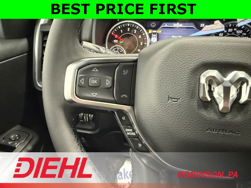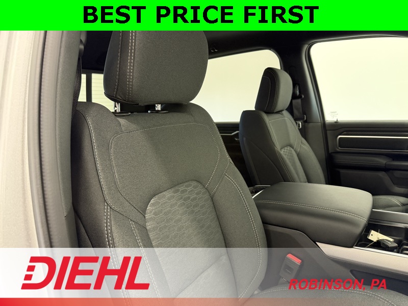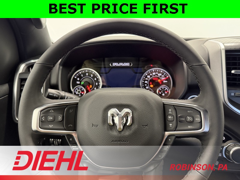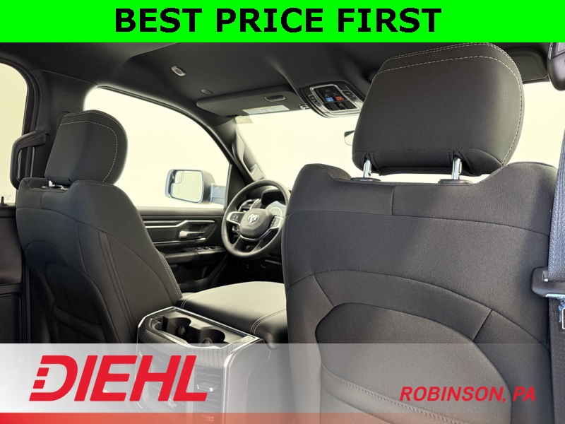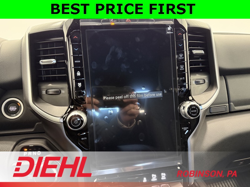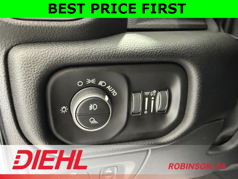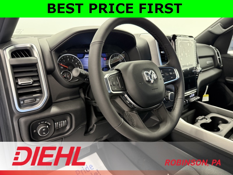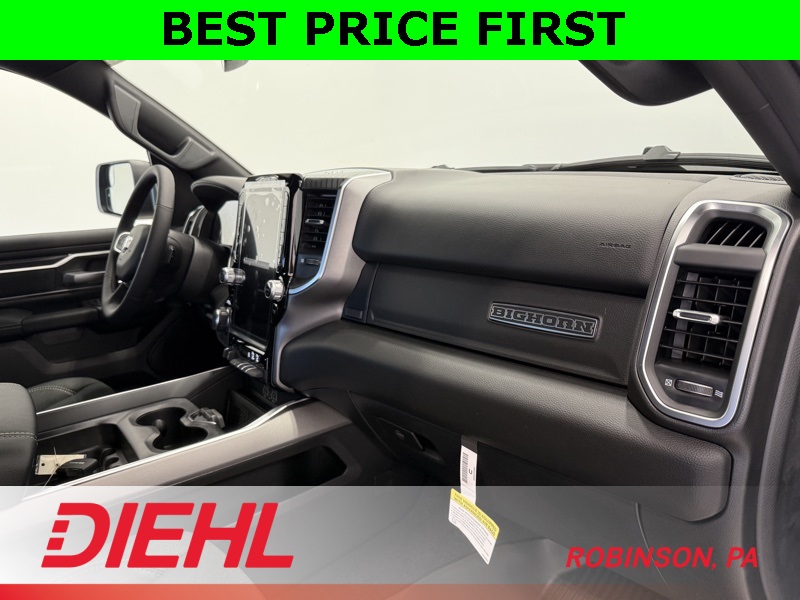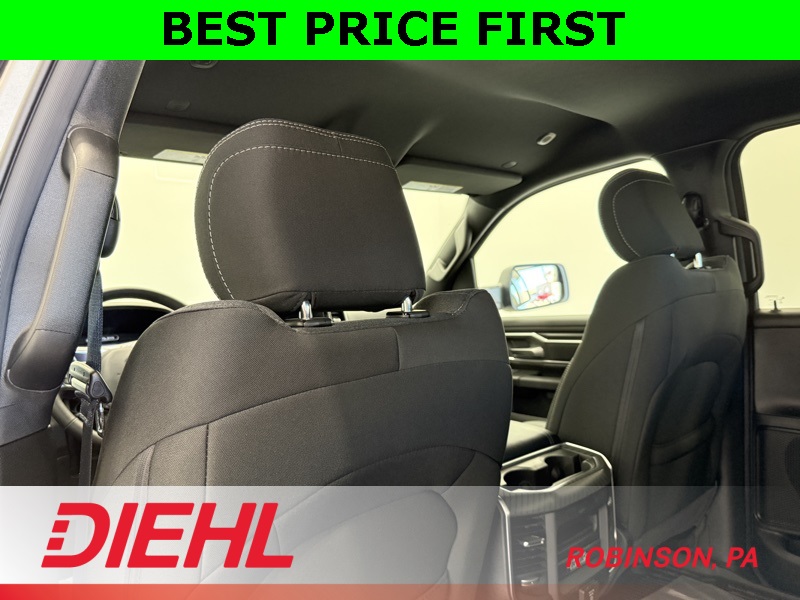 Inside, it’s all comfort and capability. The spacious Crew Cab offers generous legroom and plush Deluxe Cloth seating, while the Big Horn Level 2 Equipment Group adds premium touches like dual-zone climate control, remote start, power-adjustable pedals, and a heated steering wheel. The massive 12-inch Uconnect touchscreen with Apple CarPlay and Android Auto turns every trip into a tech-powered joyride.