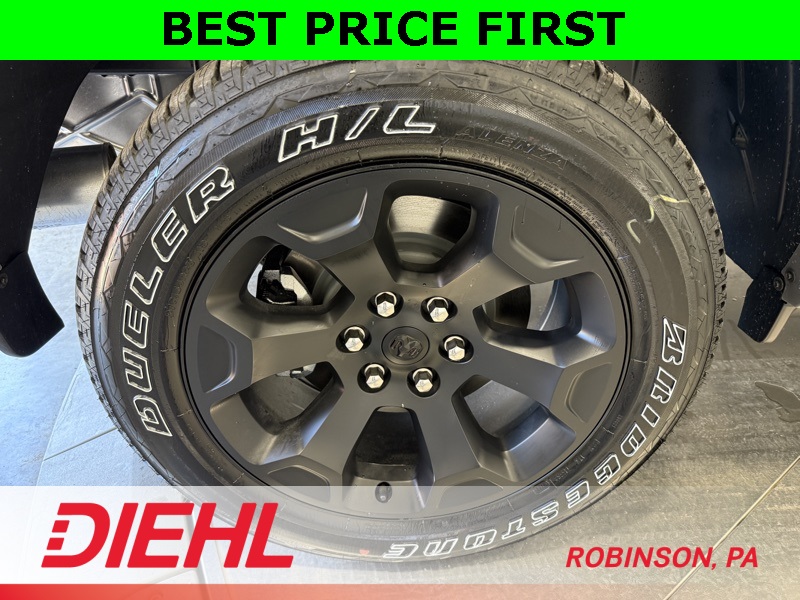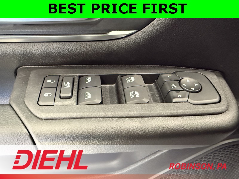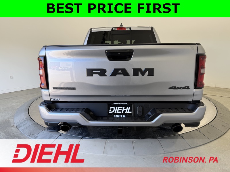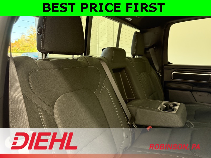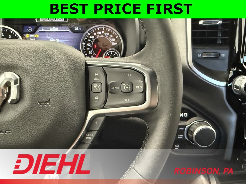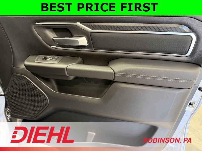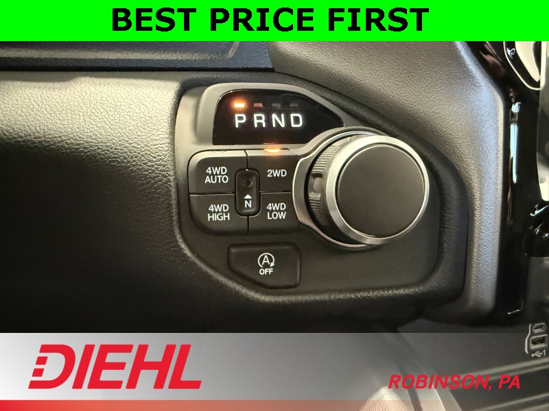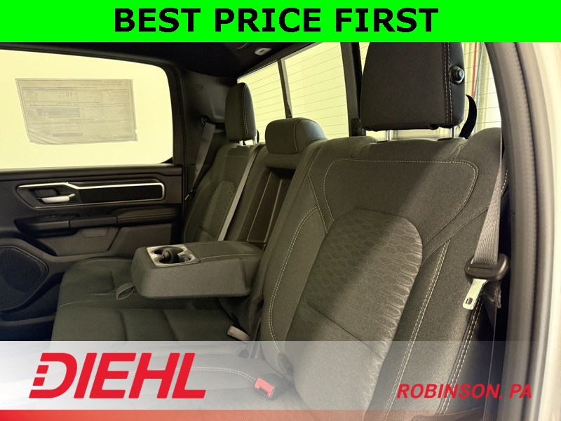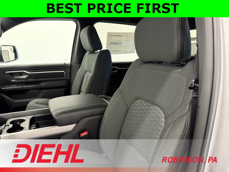 Inside, it’s all comfort and capability. The spacious Crew Cab offers generous legroom and plush Deluxe Cloth seating, while the Big Horn Level 2 Equipment Group adds premium touches like dual-zone climate control, remote start, power-adjustable pedals, and a heated steering wheel. The massive 12-inch Uconnect touchscreen with Apple CarPlay and Android Auto turns every trip into a tech-powered joyride.