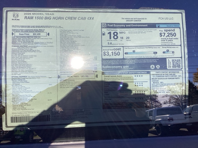 Diamond Black Crystal Pearlcoat 2026 1500 Ram Big Horn/Lone Star 4D Crew Cab 4WD 8-Speed Automatic HEMI 5.7L V8 Multi Displacement VVT eTorque Price includes: $2000 - 2026 National SFS Lease Loyalty Bonus Cash . Exp. 01/05/2026 $3500 - 2026 National Retail Consumer Cash . Exp. 01/05/2026