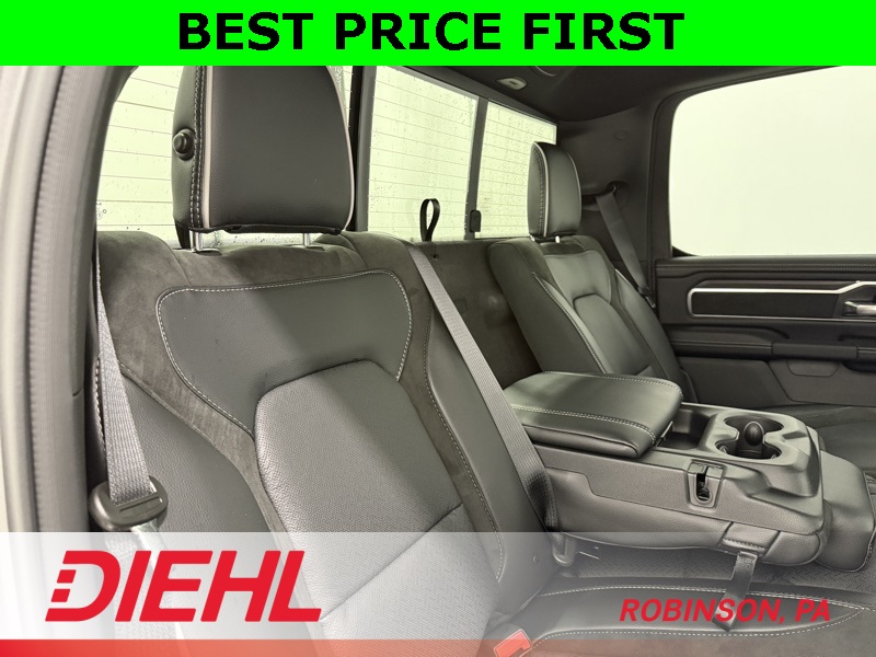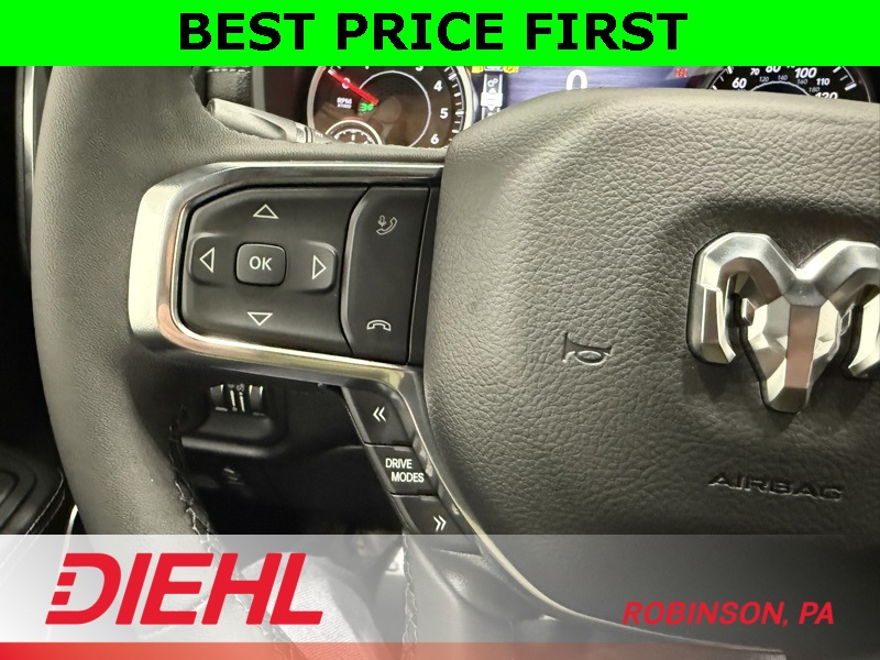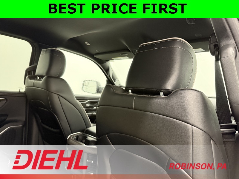 Step inside and it’s pure class. Premium leather-trimmed seats with heating and ventilation keep you comfortable year-round, while memory functions remember exactly how you like your throne positioned. The Uconnect 5 system with a 12-inch touchscreen brings navigation, Apple CarPlay, Android Auto, and an intuitive interface that makes every drive smarter. Dual-zone automatic climate control, power pedals, and a heated steering wheel round out a cabin that redefines what a pickup can be.