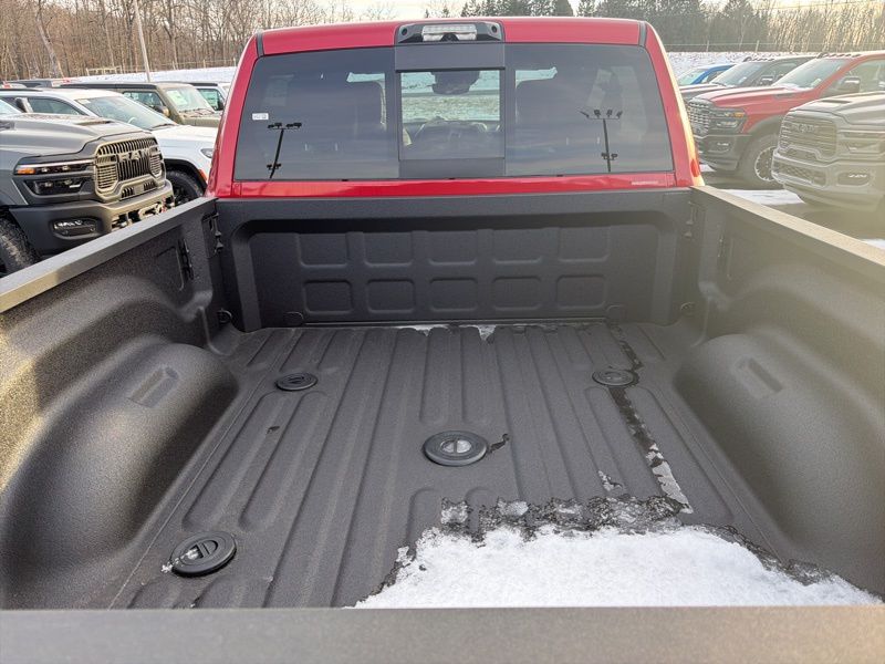 Technology centers around Uconnect 5 Navigation with a 12 inch display, GPS navigation, HD Radio, SiriusXM with 360L, Alexa Built-in, Apple CarPlay, Google Android Auto, integrated voice command with Bluetooth, Connected Travel and Traffic Services, a 4G LTE Wi-Fi hot spot, dual wireless charging pad, and Off-Road Info Pages. LED bed lighting, MOPAR deployable bed step, MOPAR spray in bedliner, and remote tailgate release enhance cargo access.
