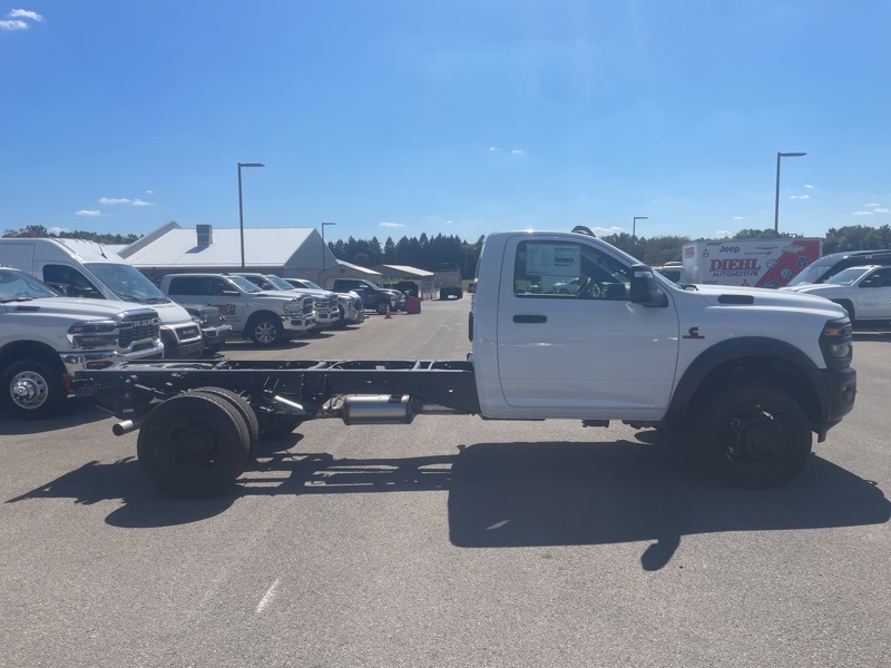 Heavy Duty Snow Plow Prep Group (Heavy Duty Front Suspension Group and Upgraded Rear HD Stabilizer Bar), Max Tow Package (Trailer Brake Control and Trailer Light Check), Quick Order Package 25A Tradesman, Tradesman Level 1 Equipment Group (Black Exterior Mirrors, Black Power Heated Fold Telescope Mirrors, Exterior Mirrors Courtesy Lamps, Exterior Mirrors with Heating Element, Exterior Mirrors with Supplemental Signals, Front 1-Touch Down Power Windows, Manual Folding Exterior Mirrors, Manuarl Telescoping Mirrors, Mirror Running Lights, Power Adjust Mirrors, Power-Adjustable Convex Aux Mirrors, Rear Window Defroster, Remote Keyless Entry, Speed Sensitive Power Locks, and Upgraded Door Trim Panel), 4 Speakers, 4-Wheel Disc Brakes, 4.44 Axle Ratio, 40/20/40 Split Bench Seat, 4G LTE Wi-Fi Hot Spot, ABS brakes, Air Conditioning, AM/FM radio: SiriusXM, Apple CarPlay, Apple CarPlay/Android Auto, Cargo and CHMSL Lamp, Compass, Connectivity - US/Canada, Delay-off headlights, Driver door bin, Dual front impact airbags, Dual rear wheels, Electronic Stability Control, Emergency communication system: RAM Connect, For Details, Visit DriveUconnect.com, Front anti-roll bar, Front Armrest with Cupholders, Front Center Armrest w/Storage, Front fog lights, Front License Plate Bracket, Front reading lights, Fully automatic headlights, Global Telematics Box Module, Google Android Auto, GPS Antenna Input, Integrated Voice Command with Bluetooth, Manual Adjust 4-Way Driver Seat, Manual Adjust 4-Way Front Passenger Seat, Occupant sensing airbag, Outside temperature display, Overhead console, ParkView Rear Back-Up Camera, Passenger door bin, Passenger vanity mirror, Power steering, Power Take-Off Right/Left, Radio data system, Radio: Uconnect 5 with 8.4" Display, Rear anti-roll bar, Remote USB Port - Charge Only, Speed control, Tachometer, Temperature and Compass Gauge, Tilt steering wheel, Traction control, Variably intermittent wipers, Voltmeter, and Wheels: 19.5" x 6.0" Black Painted SteeL. Bright White Clearcoat 2026 Ram 5500HD Tradesman 4WD 8-Speed Automatic Cummins 6.7L I6 Turbodiesel