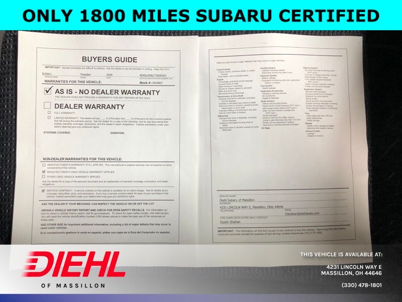 Automatic Emergency Steering, Blind-Spot Detection (BSD)/RCTA System, Emergency Lane Keep Assist, Power Rear Gate, Power Rear Gate and Blind Spot Detection with Rear Cross Traffic Alert. New Price! Certified. 2026 Subaru Forester Premium CARFAX One-Owner. Clean CARFAX.